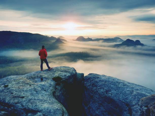 Hiker in red jacket enjoy view over clouds. Mountain rocky peak above valley.