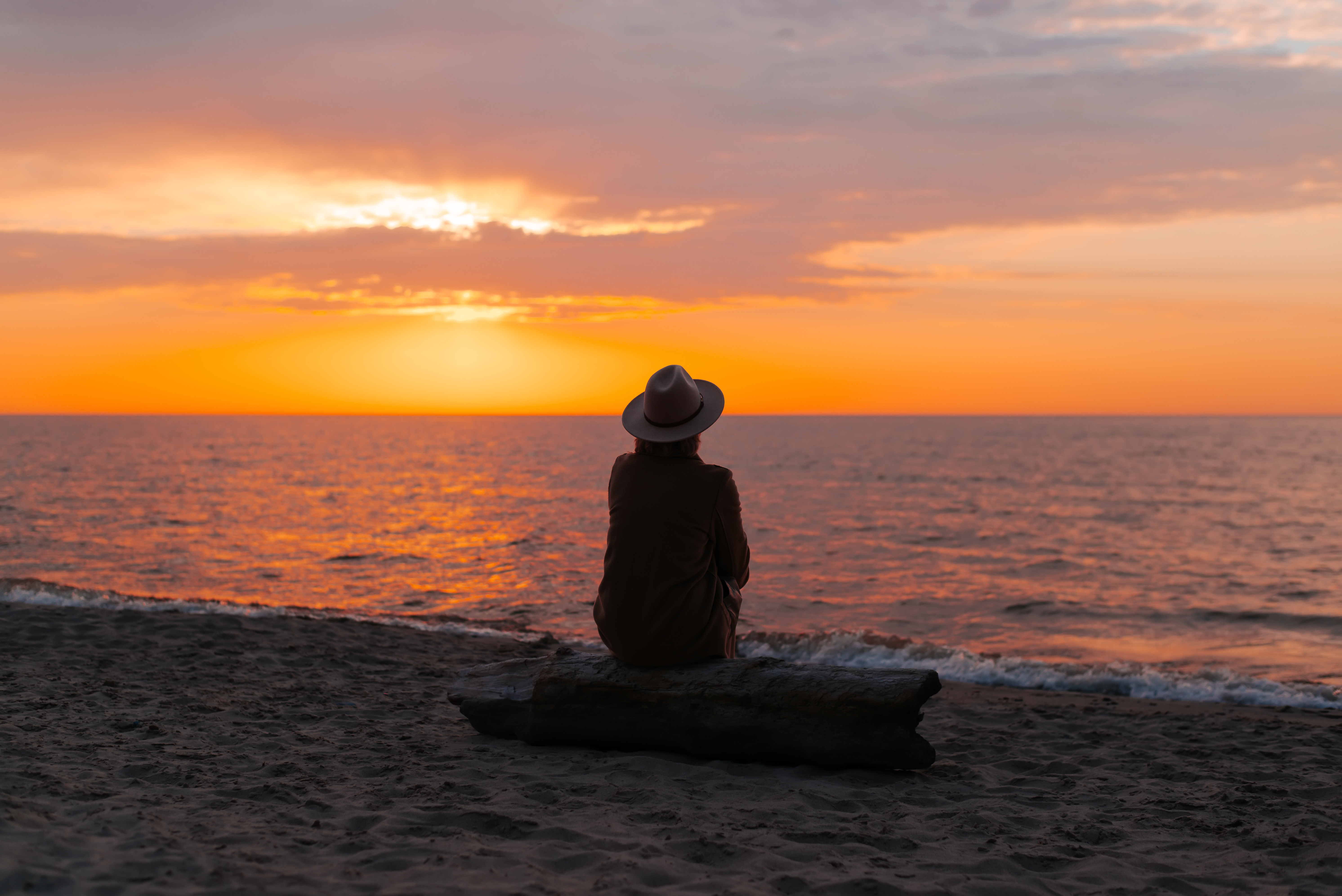 Back view of lonely adult thoughtful woman in coat and hat sitting on og on seashore and looking at sea sunset, mood. Unrecognizable pensive senior lady alone in nature in evening.