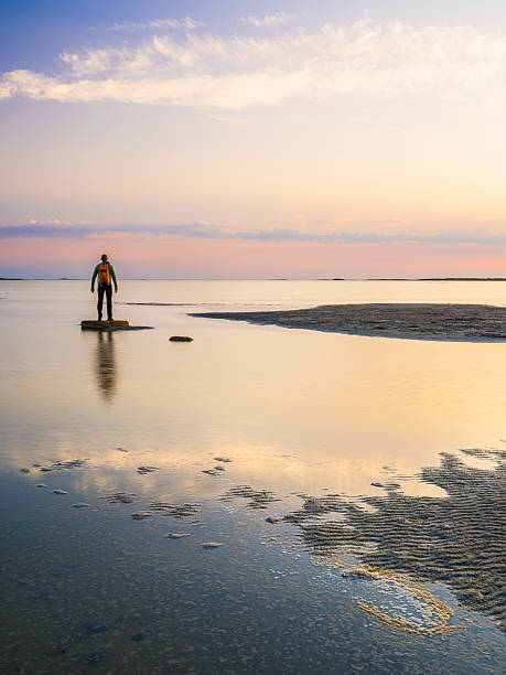 A solitary man stands on a stone in the calm sea, gazing at the stunning sunset over the horizon. Reflections shimmer on the water as the day transitions to night.