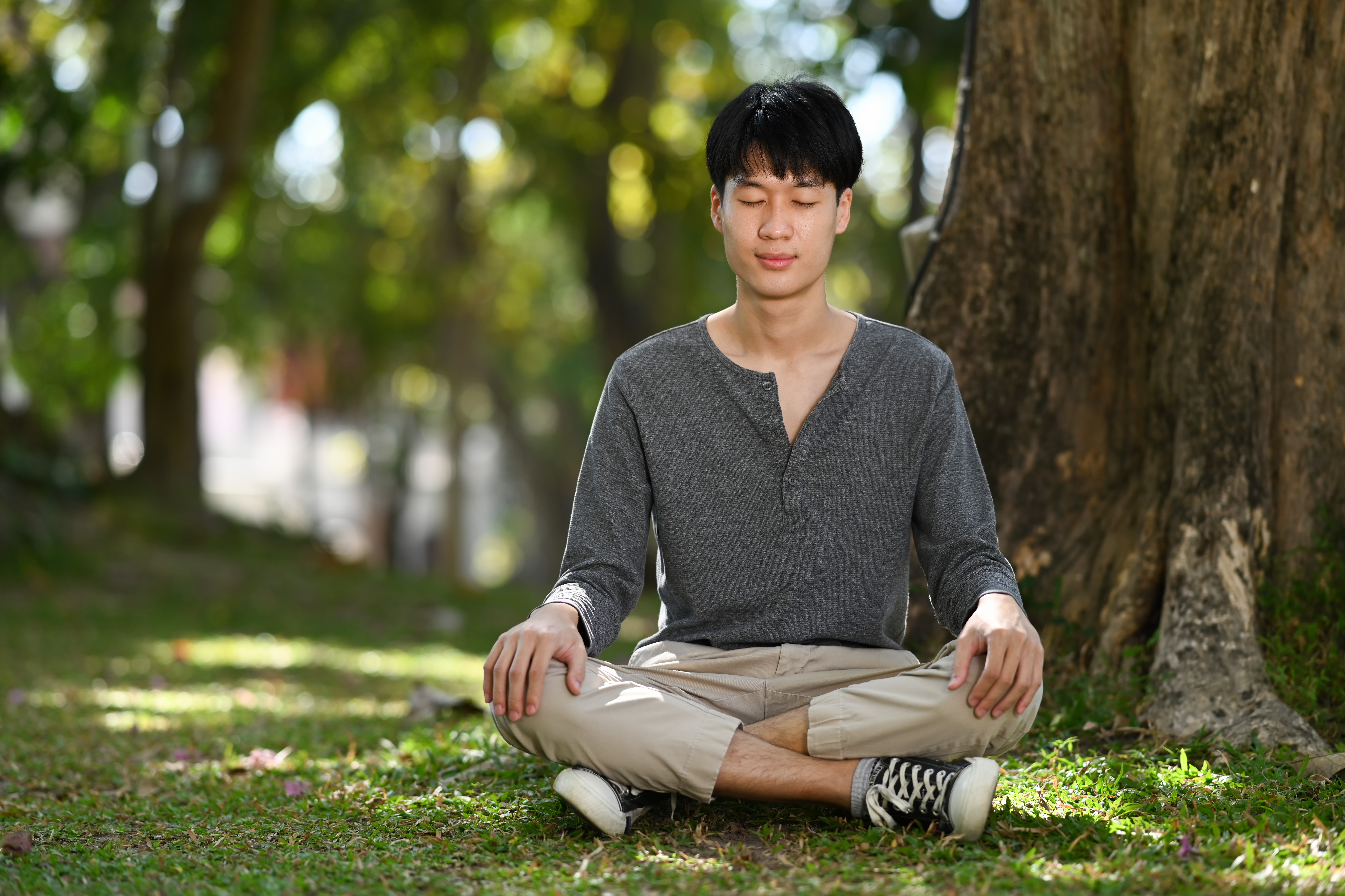 serious man writing in notebook ideas and enjoying nature in wooded area