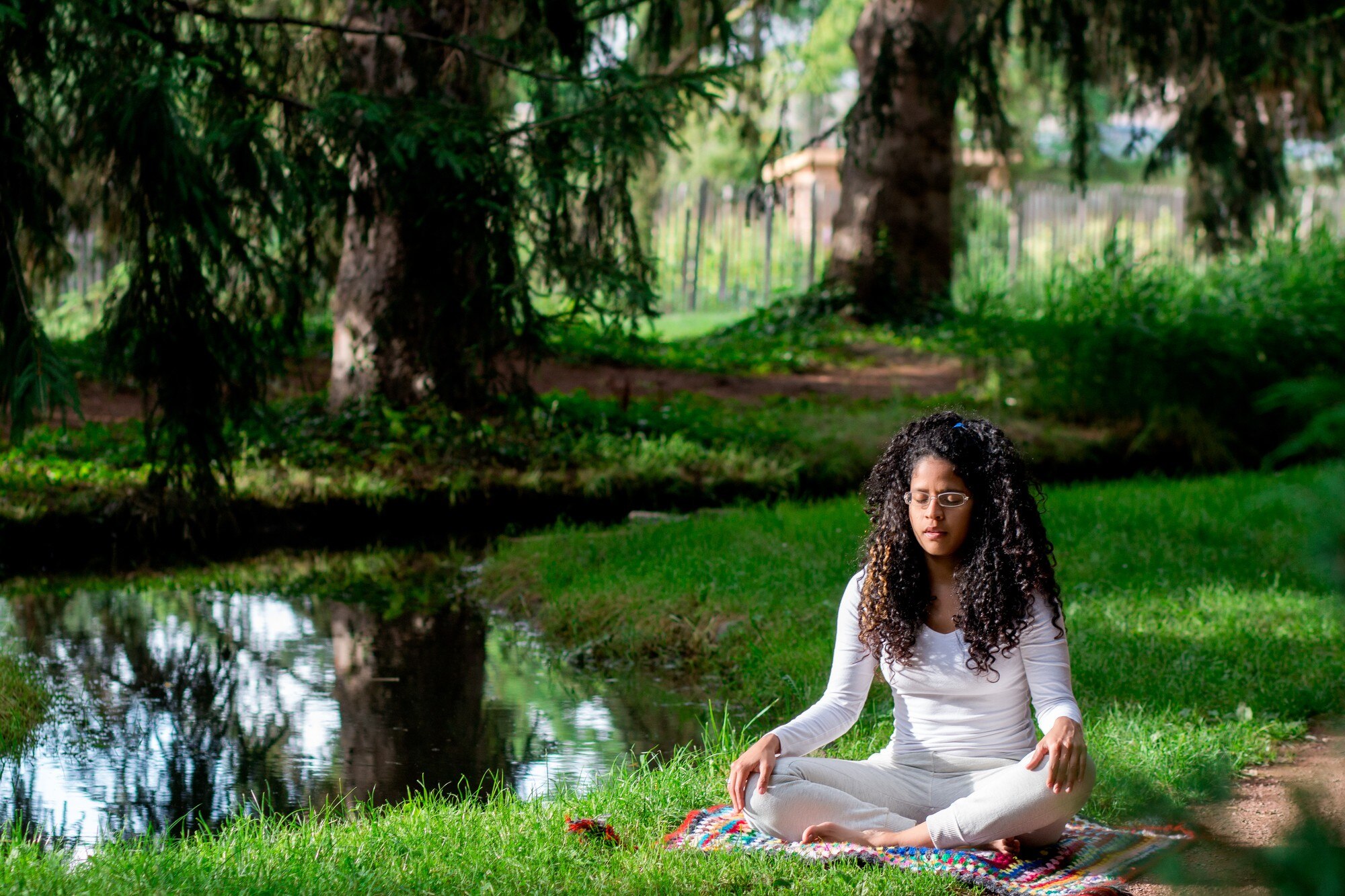 Young woman meditating peacefully under a large tree by the lake in the morning sunlight, practicing mindfulness and connection with nature outdoors