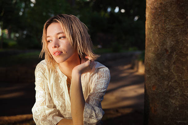 Portrait of a nostalgic young Japanese-Brazilian woman hanging out in the woods under the sunlight.