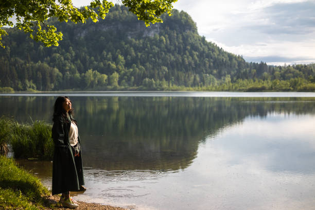 East Asian Woman aged 40-44, standing by a still lake looking up to sun after the rain. Wearing long green rain coat.