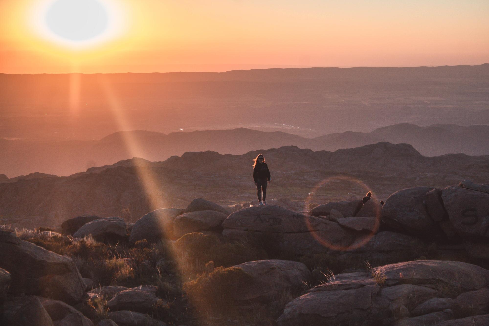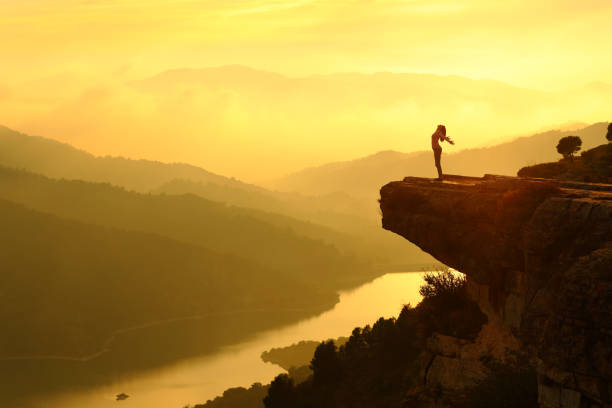 Woman silhouette breathing fresh air in the top of a cliff