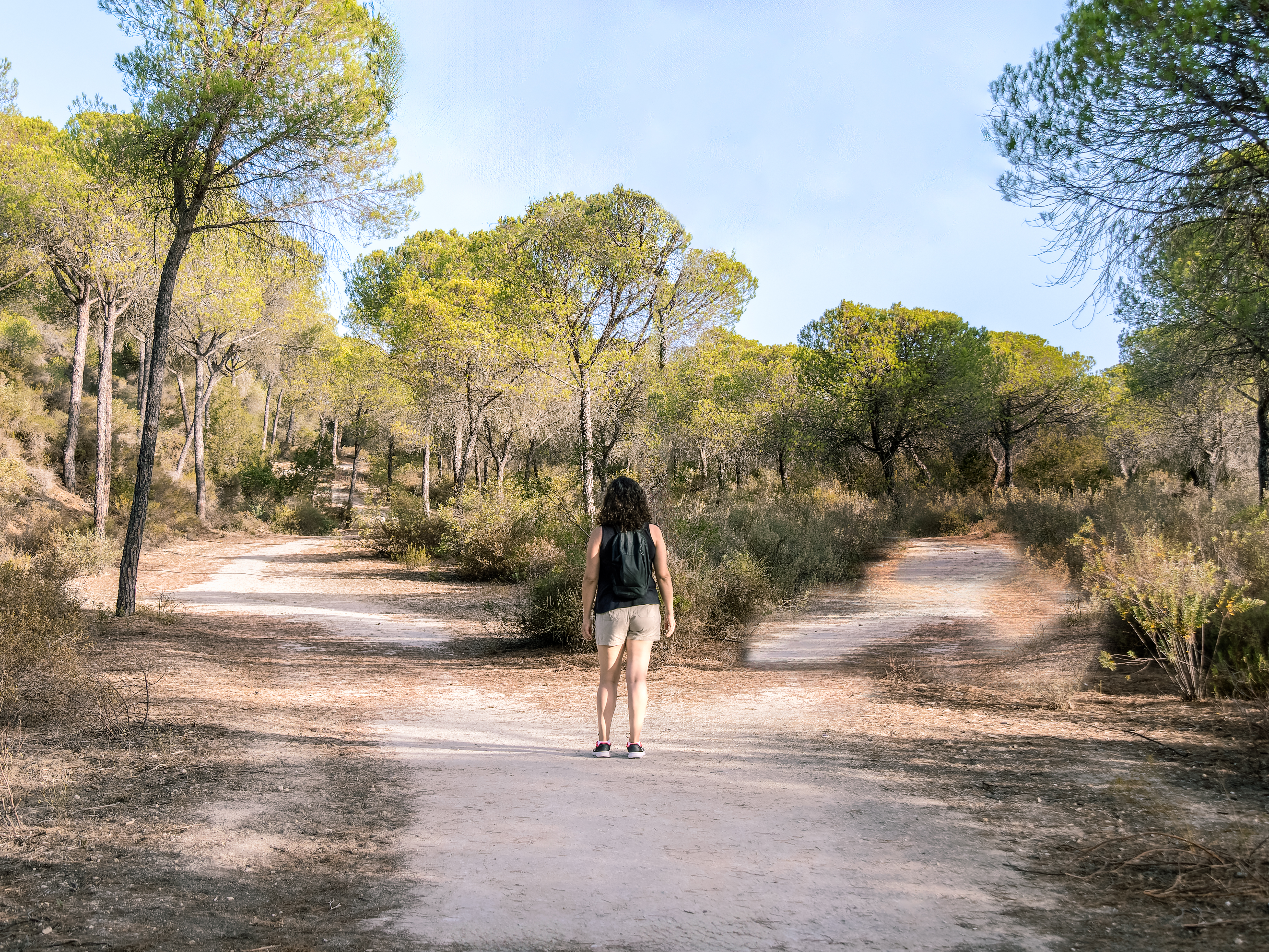 Woman choosing to take a light path or a dark path in a forest. Concept of decision making in life.