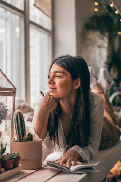 A young attractive dark-haired woman is lying on the windowsill in a greenhouse room.A smiling woman writes in a notebook.