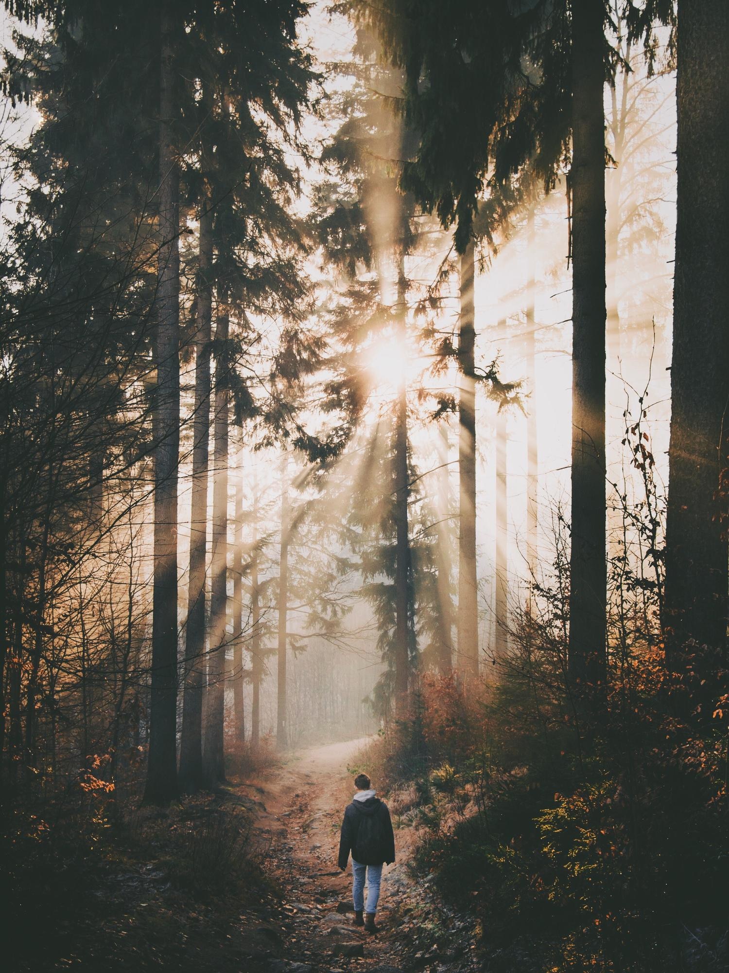 Woman choosing to take a light path or a dark path in a forest. Concept of decision making in life.