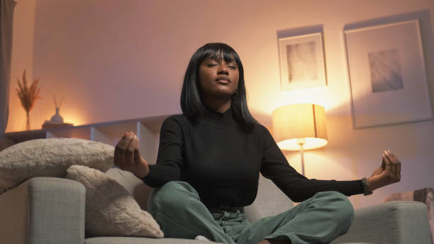 Home meditation. Evening yoga. Relaxed peaceful woman sitting cross-legged in lotus position practicing zen sitting couch in room interior.