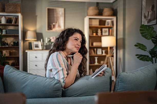 Mid adult woman sitting comfortably on sofa in living room, holding a pen and notebook, looking away in contemplation, enjoying peaceful moment of writing and reflecting