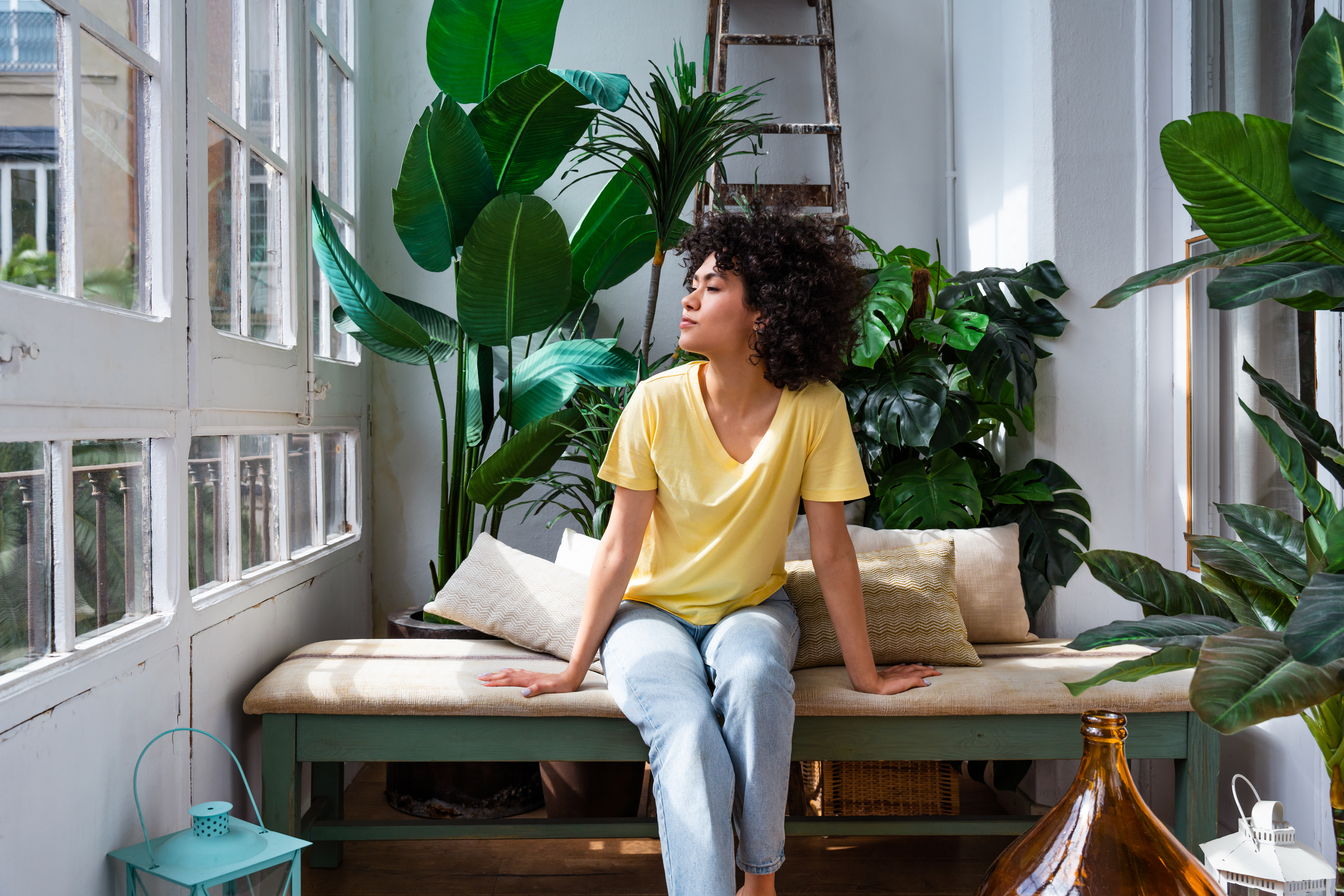 Beautiful latino young woman at home - Pretty south american with curly hair female portrait, lifestyle and domestic life scene