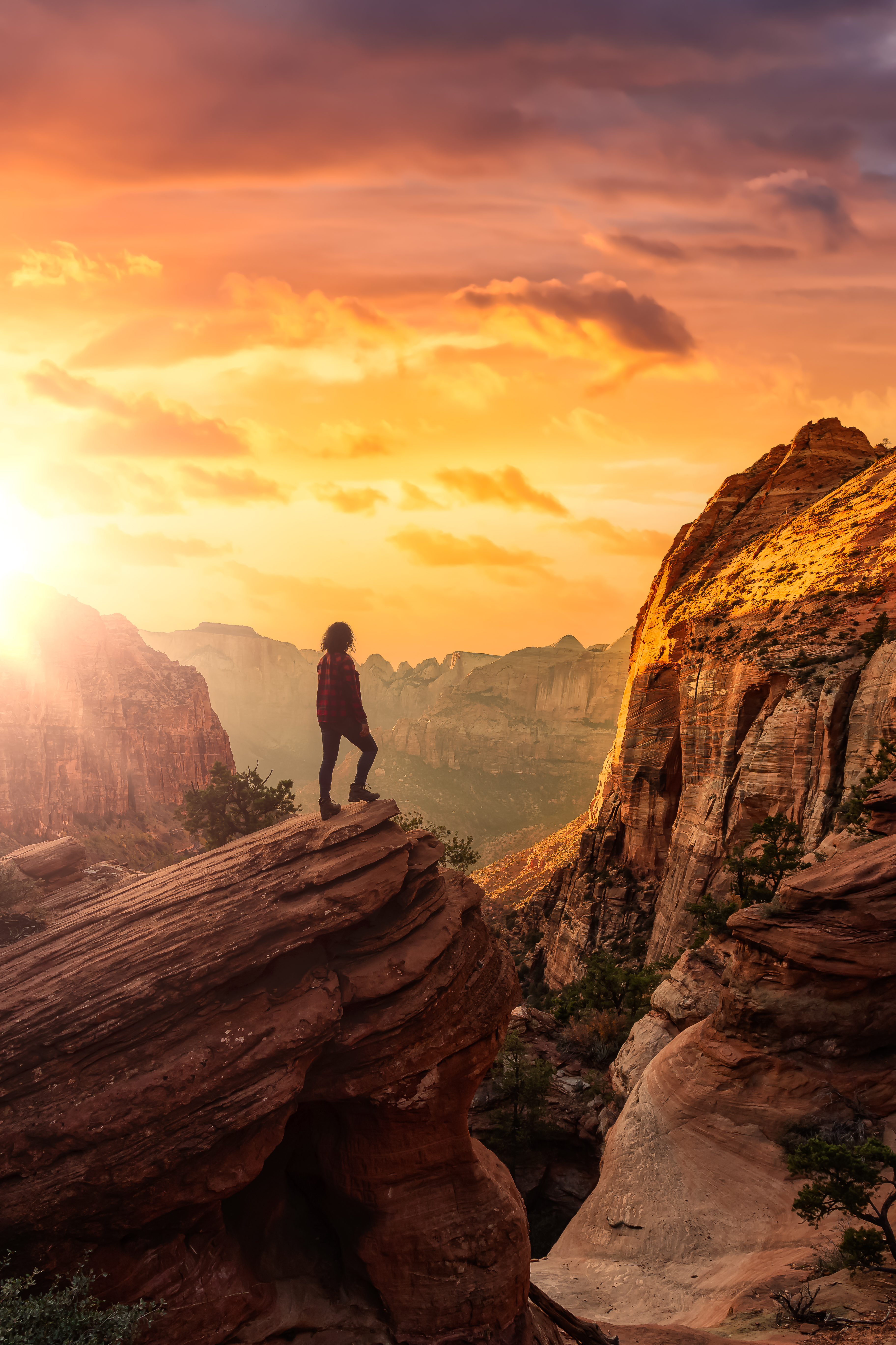 Adventurous Woman at the edge of a cliff is looking at a beautiful landscape view in the Canyon. Sunset Sky Art Render. Taken in Zion National Park, Utah, United States.