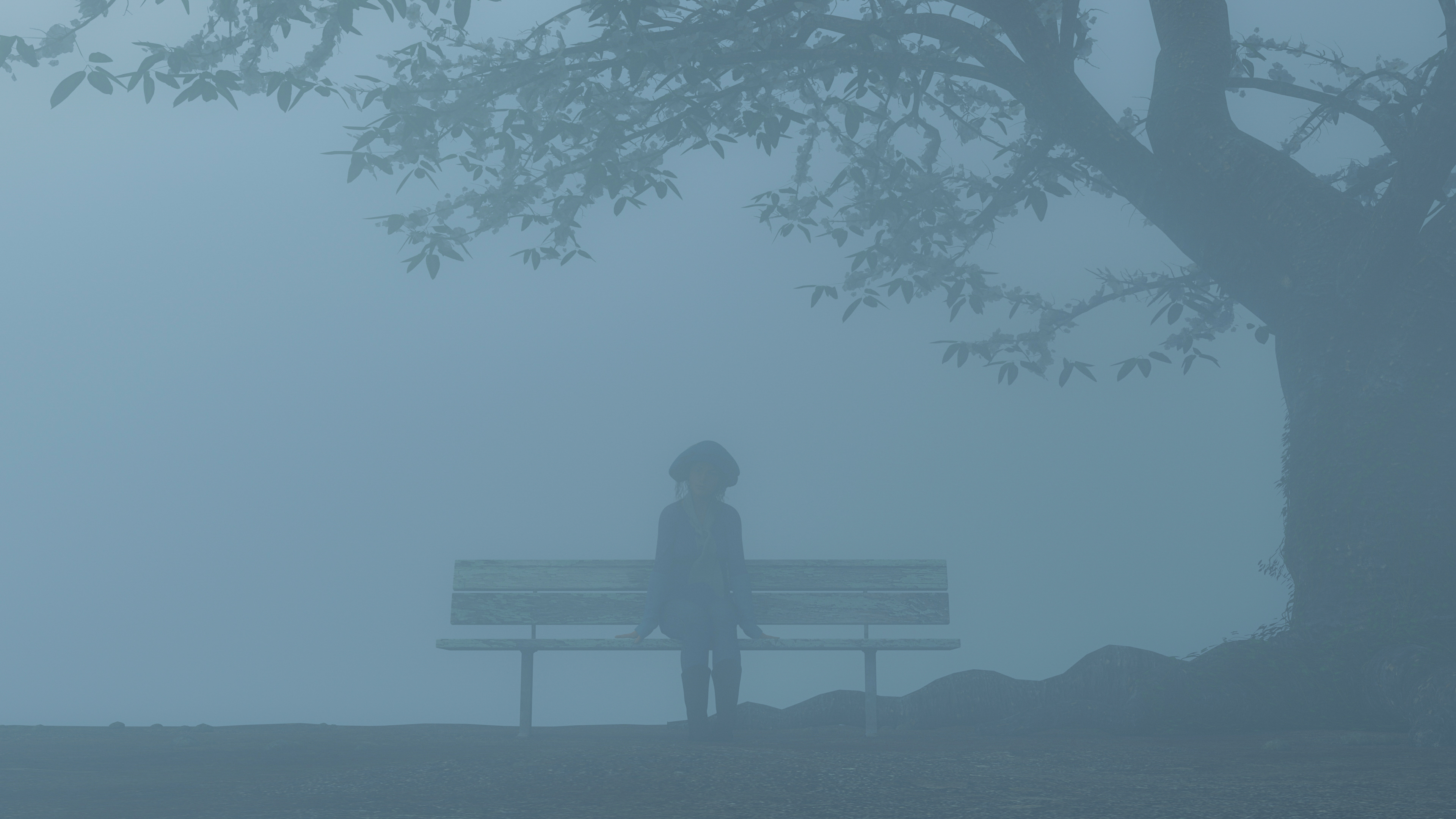 Woman sitting on bench in foggy atmosphere,3d rendering