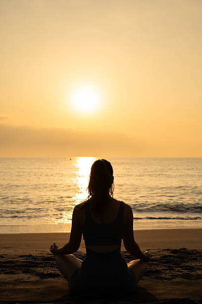 Woman practicing yoga at sunrise on the beach, finding inner peace and connecting with nature