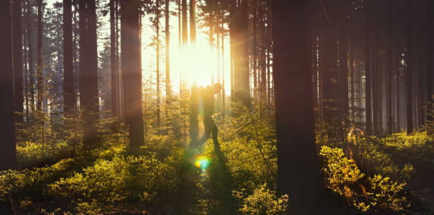 Silent German Forest in spring with beautiful bright sun rays on orange, golden sunset mood, black forest