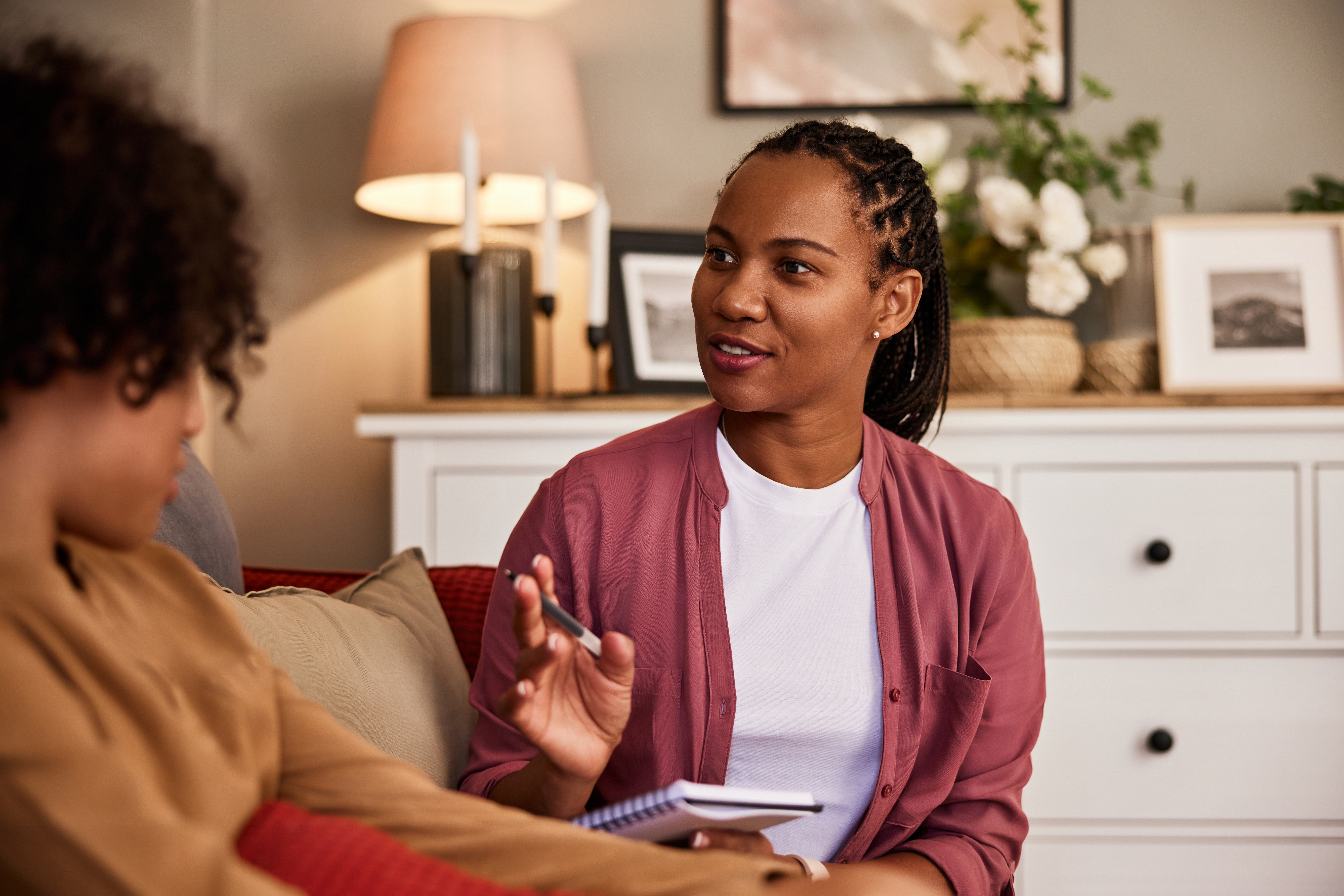 A pretty African-American female psychologist holding a notebook and talking with a teenage boy.