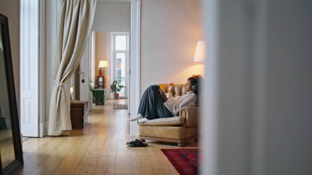 Calm girl relaxing armchair at home. Curly hair brunette listening headphones music watching tab movie at lamp light. African woman scrolling news feed at white room. Dreamy lady browsing internet