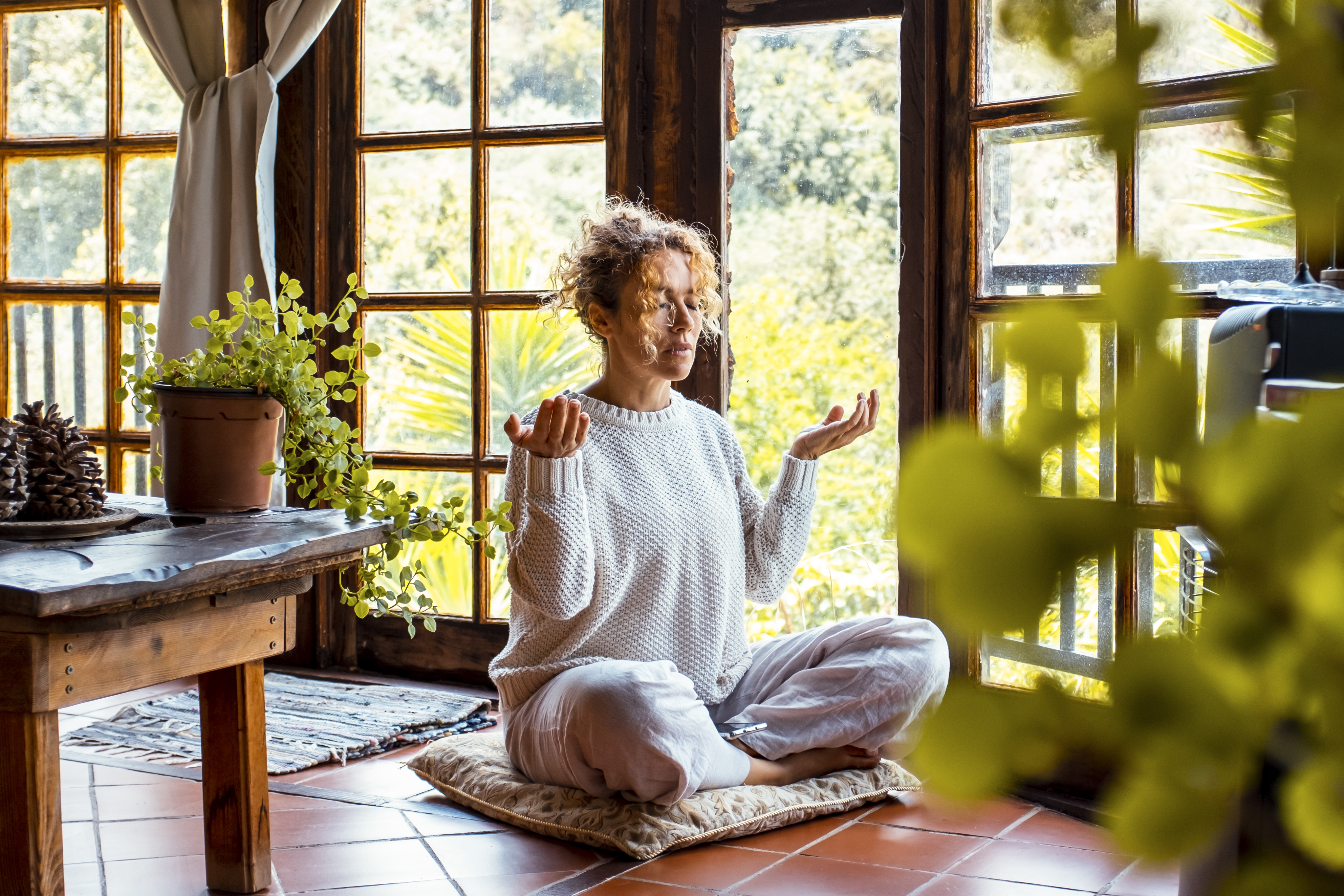 One woman at home indoor doing yoga asana meditation exercise for mental and body health. Healthy and natural lifestyle female people sitting on the floor. Meditation and zenlike activity alone