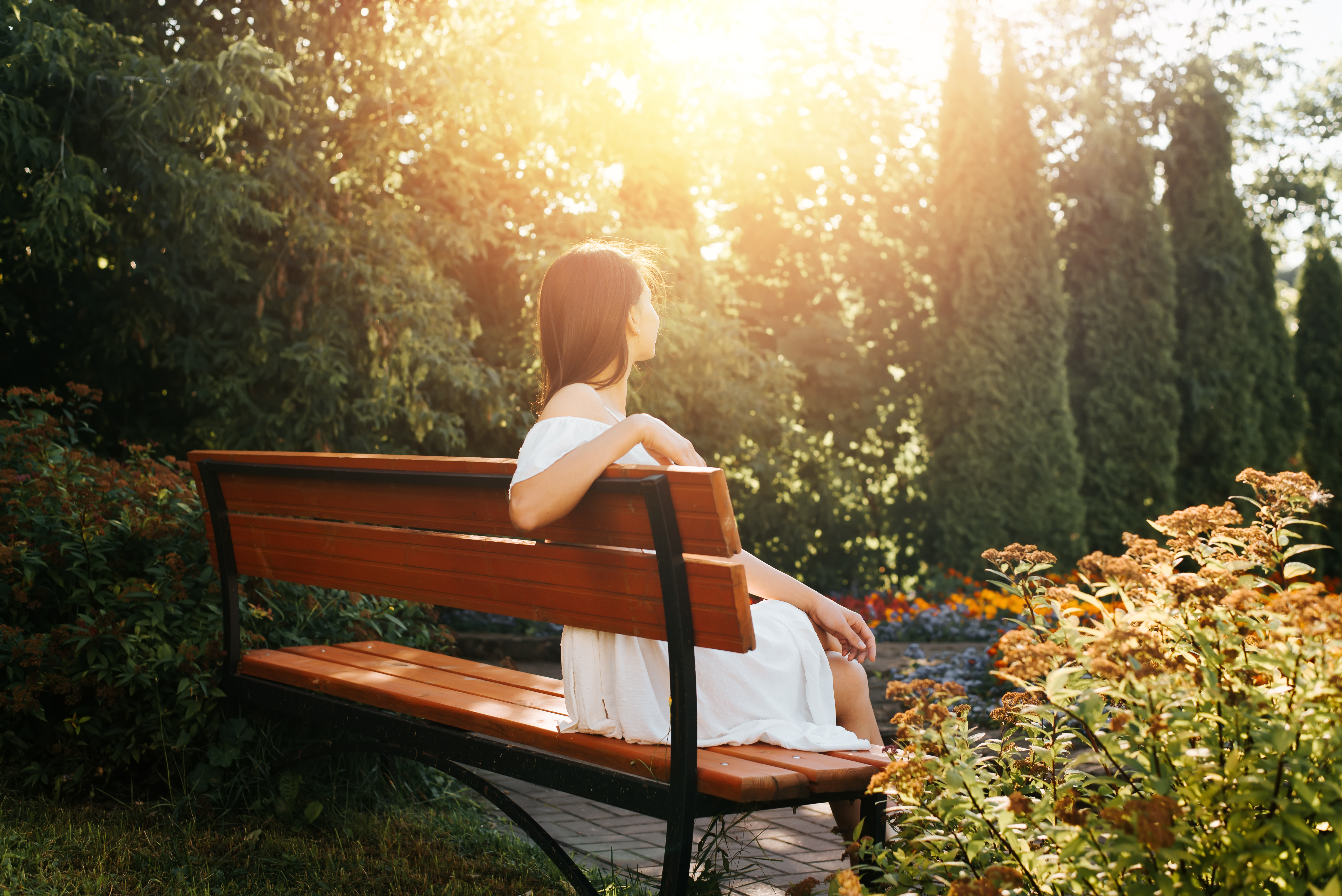 Young brunette woman in white summer dress resting, relaxing in flower garden outdoors. Back view of an elegant lady sitting on bench and enjoying sunset
