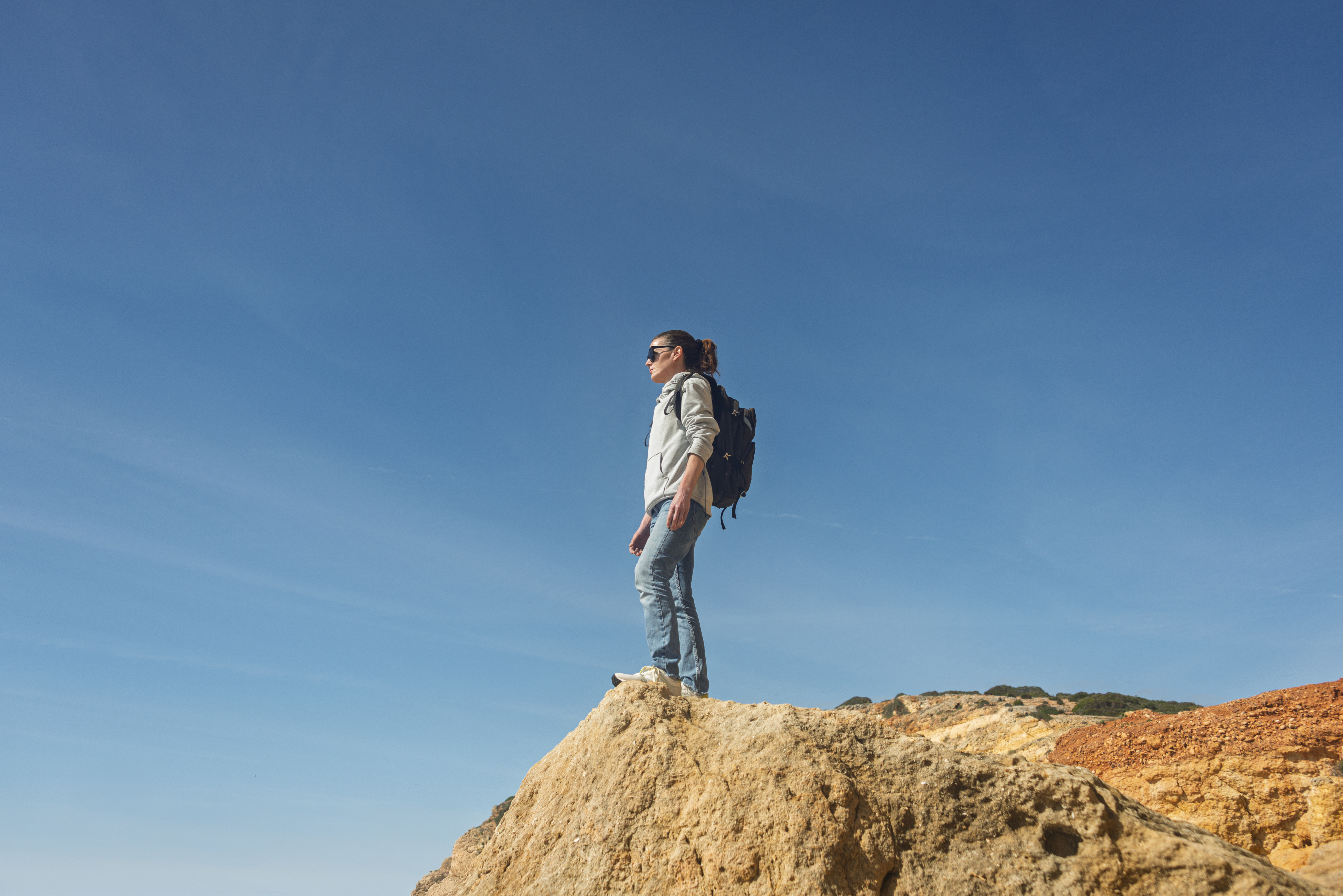 Female Hiker Standing on Cliff Edge Enjoying Scenic Views Under Clear Blue Sky