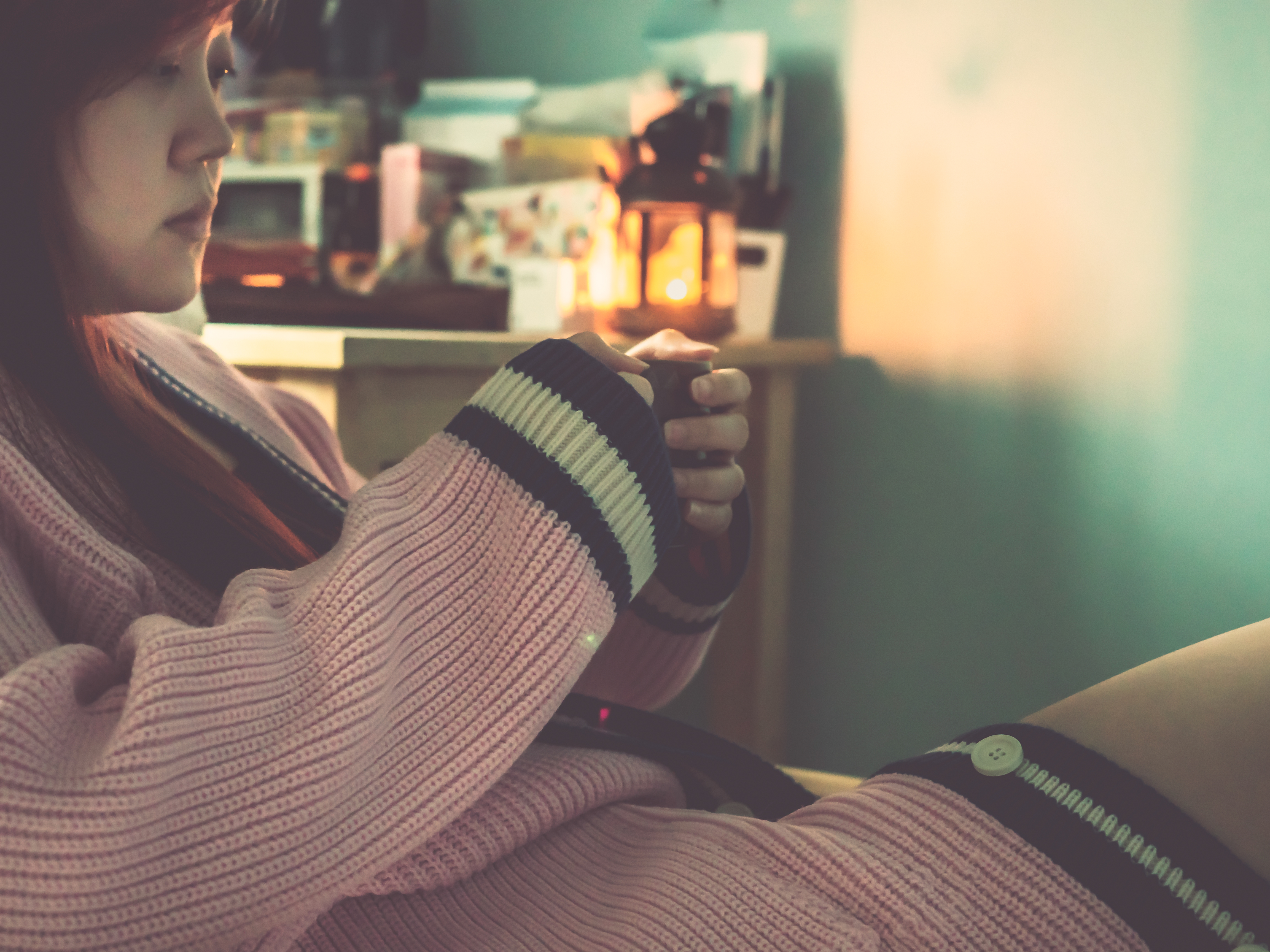 winter season and holiday event concept from beautiful asian woman in pink warm suit hold and drink hot tea or coffee in living room decorate with lantern and christmas item background