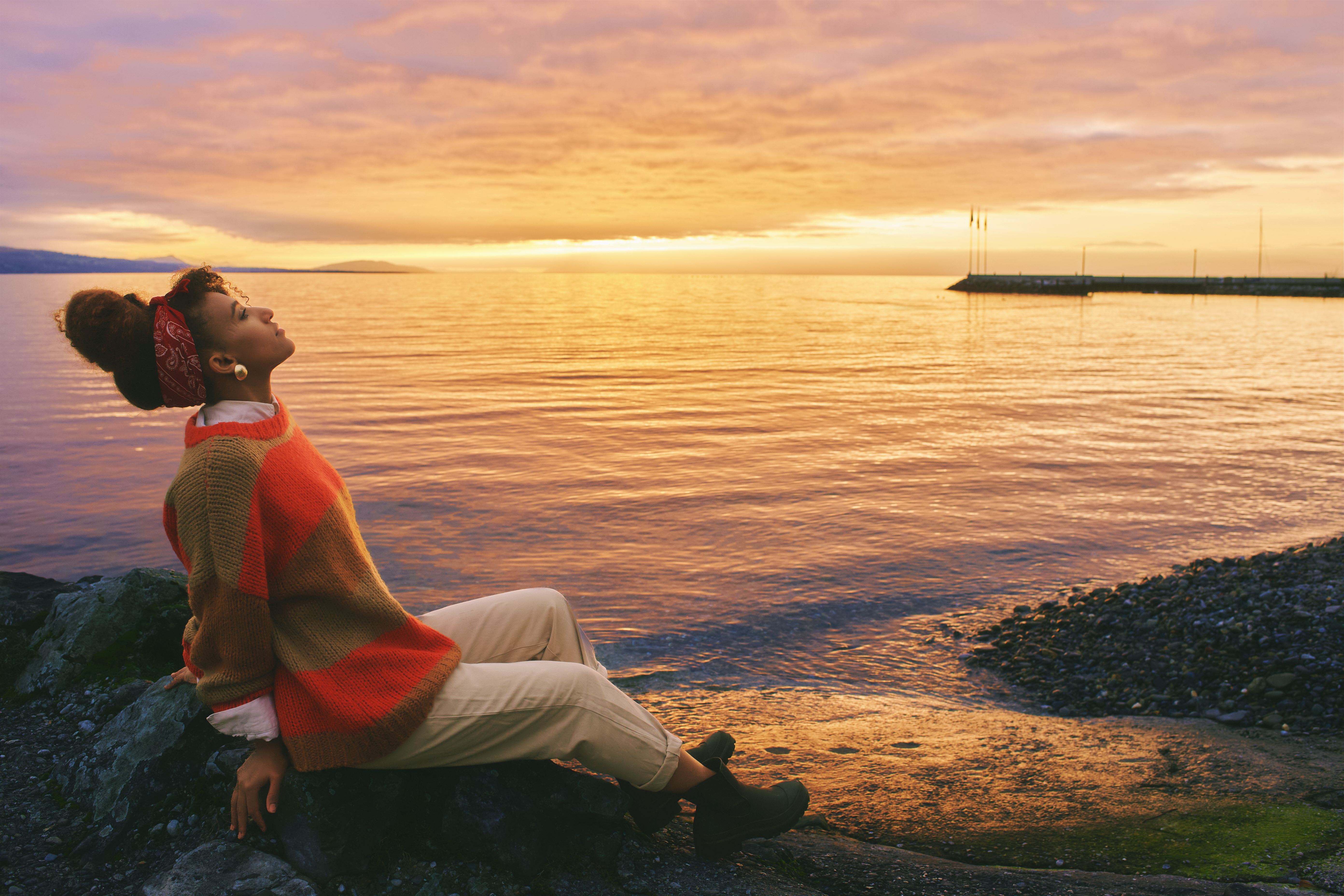 Outdoor portrait of young african woman admiring amazing sunset by the lake