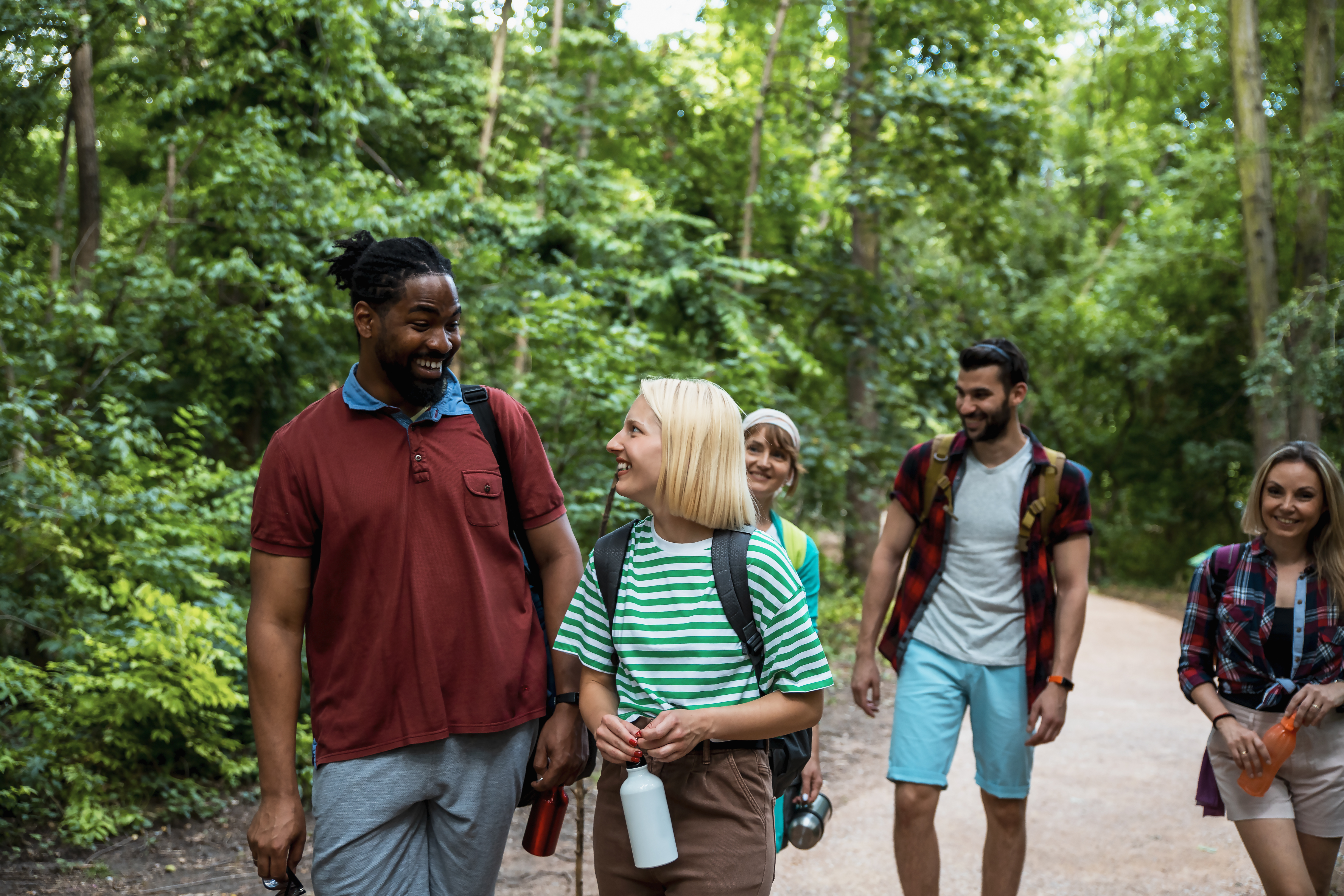 Multiethnic people Group of Hikers in the green forest, walking on the trail and talking. Copy space