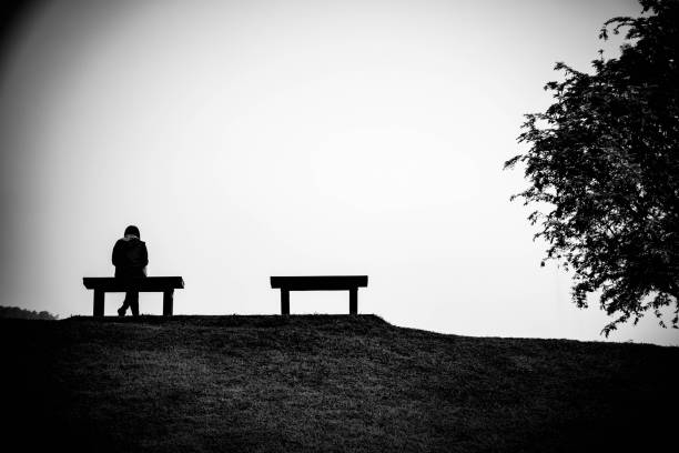 Woman sit on bench on small hill , color effect with silhouette dark tone