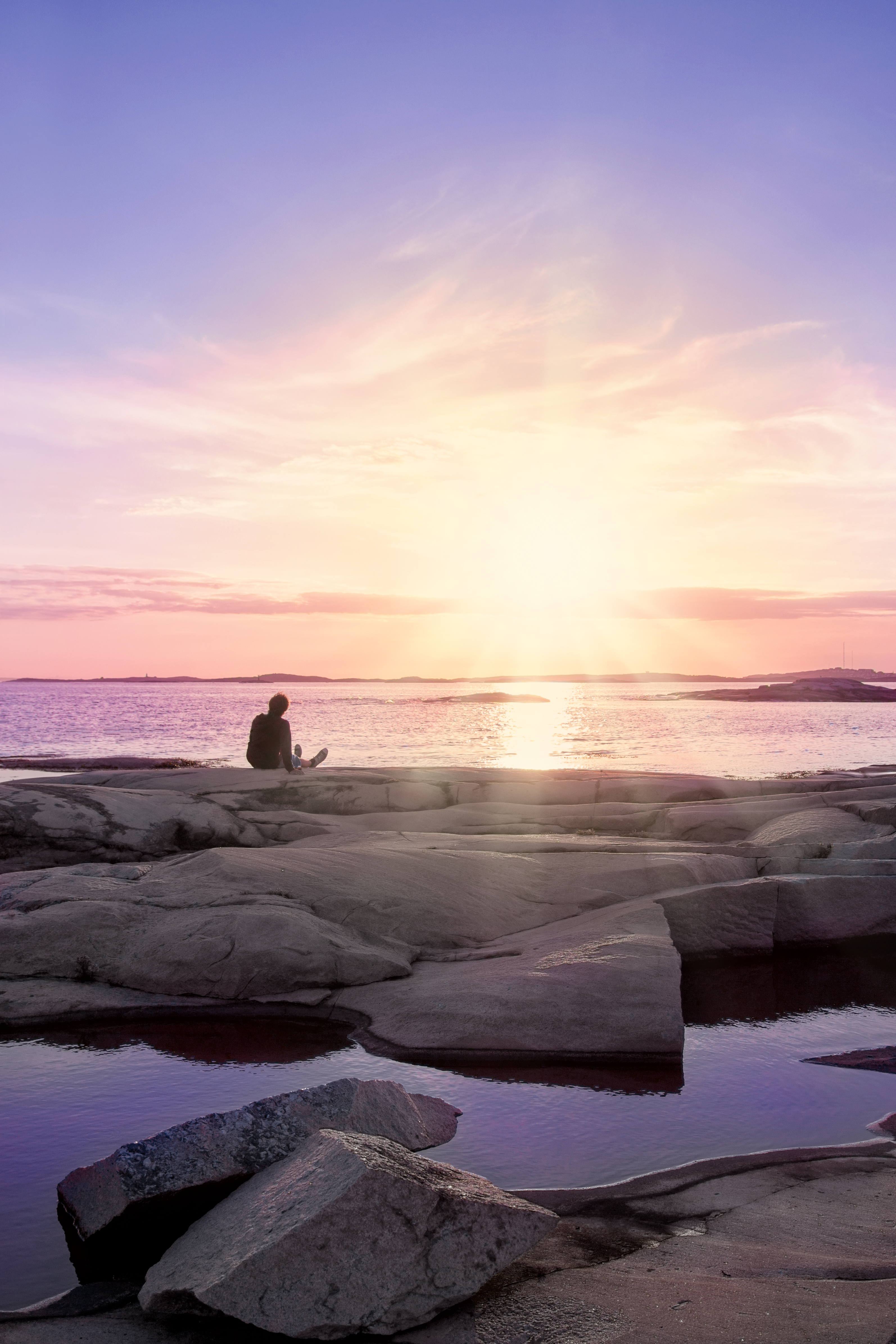 One person sitting on rock coastline in Sweden and looking at a beautiful sunset in blue, purple, pink and orange colors. Photographed in summertime in the swedish west coast and shows people’s comfort and fascination for nature.