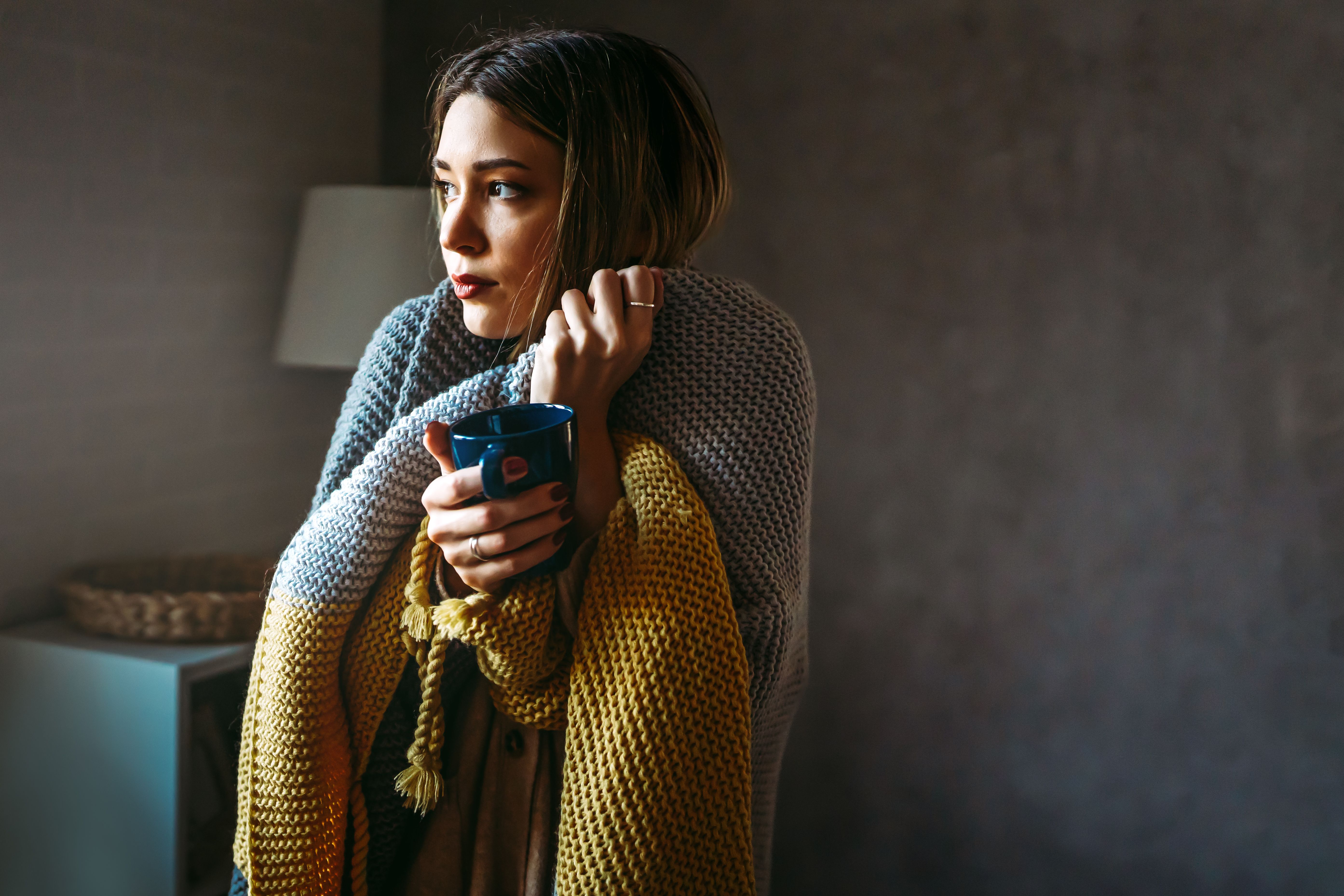 Freezing woman covered with a cozy blanket. Female wrapped in warm blanket, drinking hot drink. Cold flu concept.