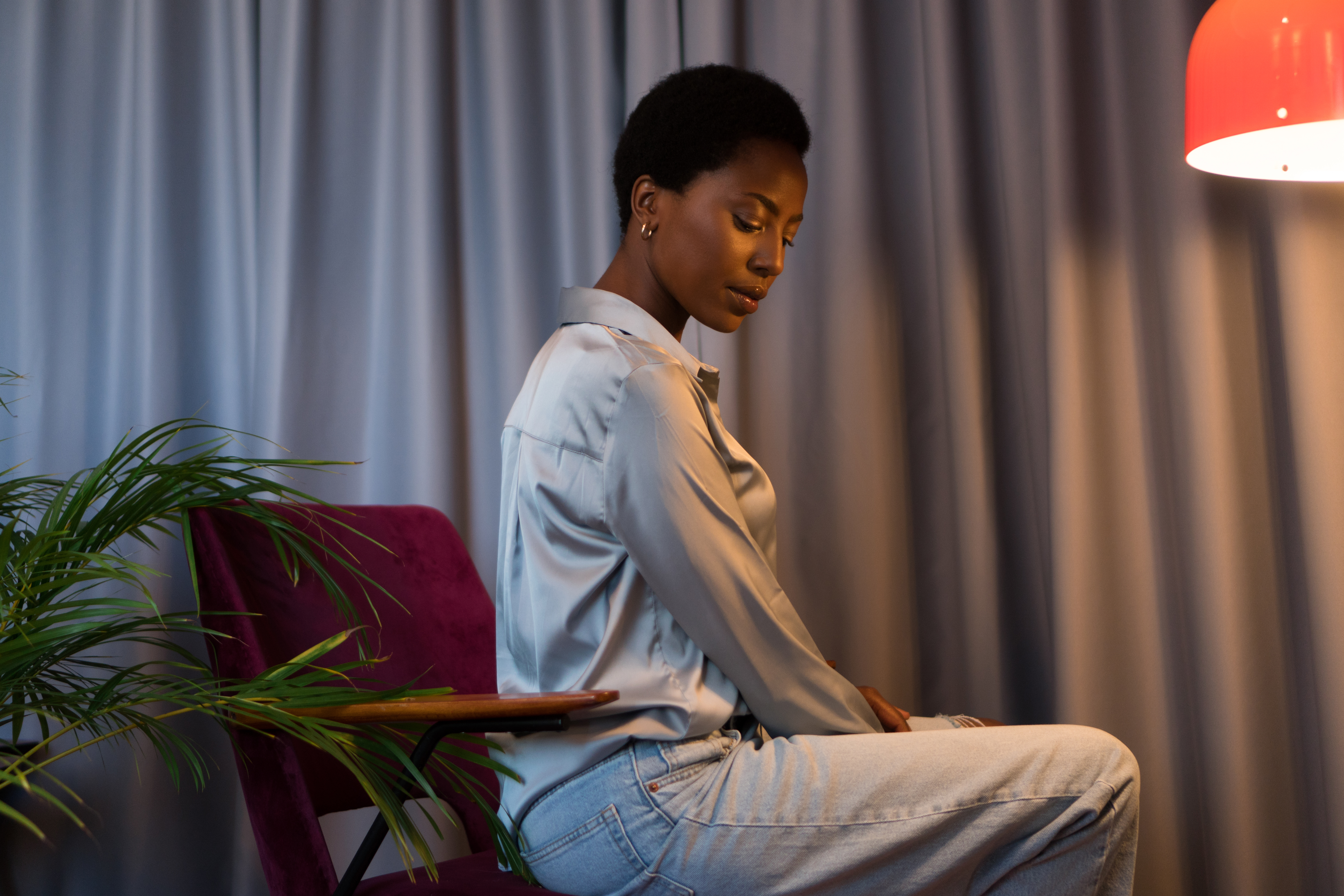 A shot of a young African American woman sitting confidently on the armchair and looking at the camera.