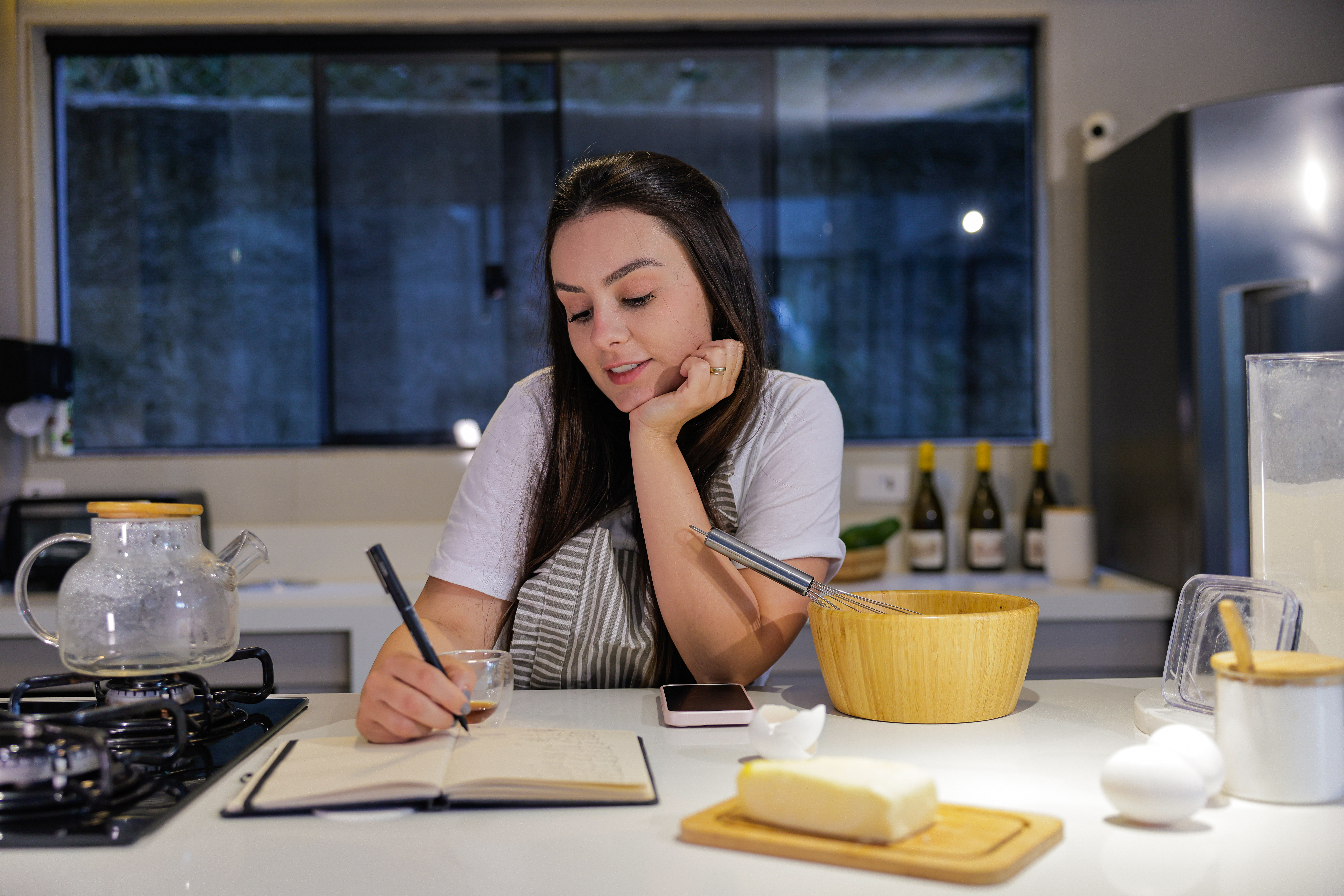 Young woman writing down recipe in notebook and drinking coffee in kitchen