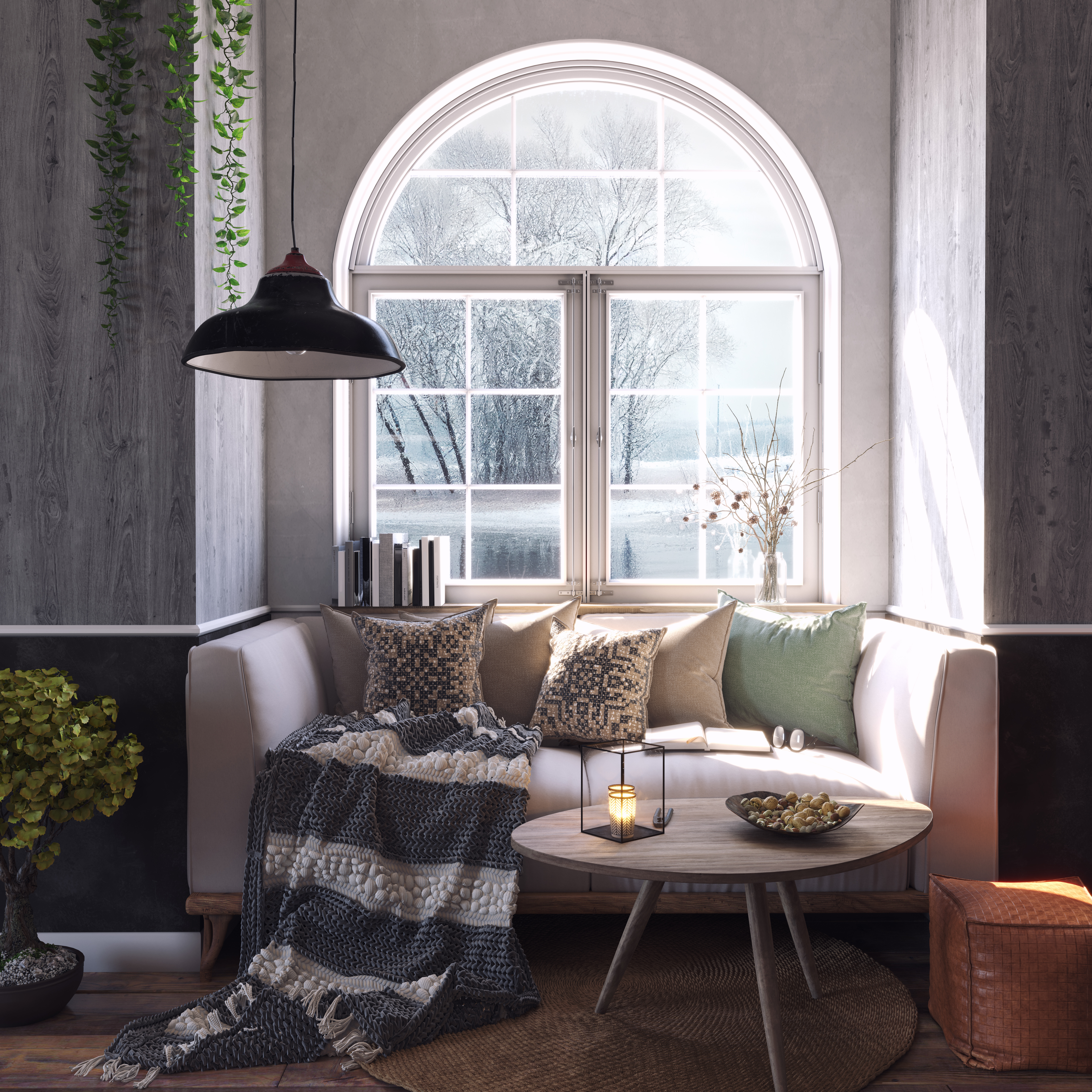 Cup of black tea with paper open book and burning scented candle on marble table over Christmas lights in bedroom. Cozy home atmosphere.