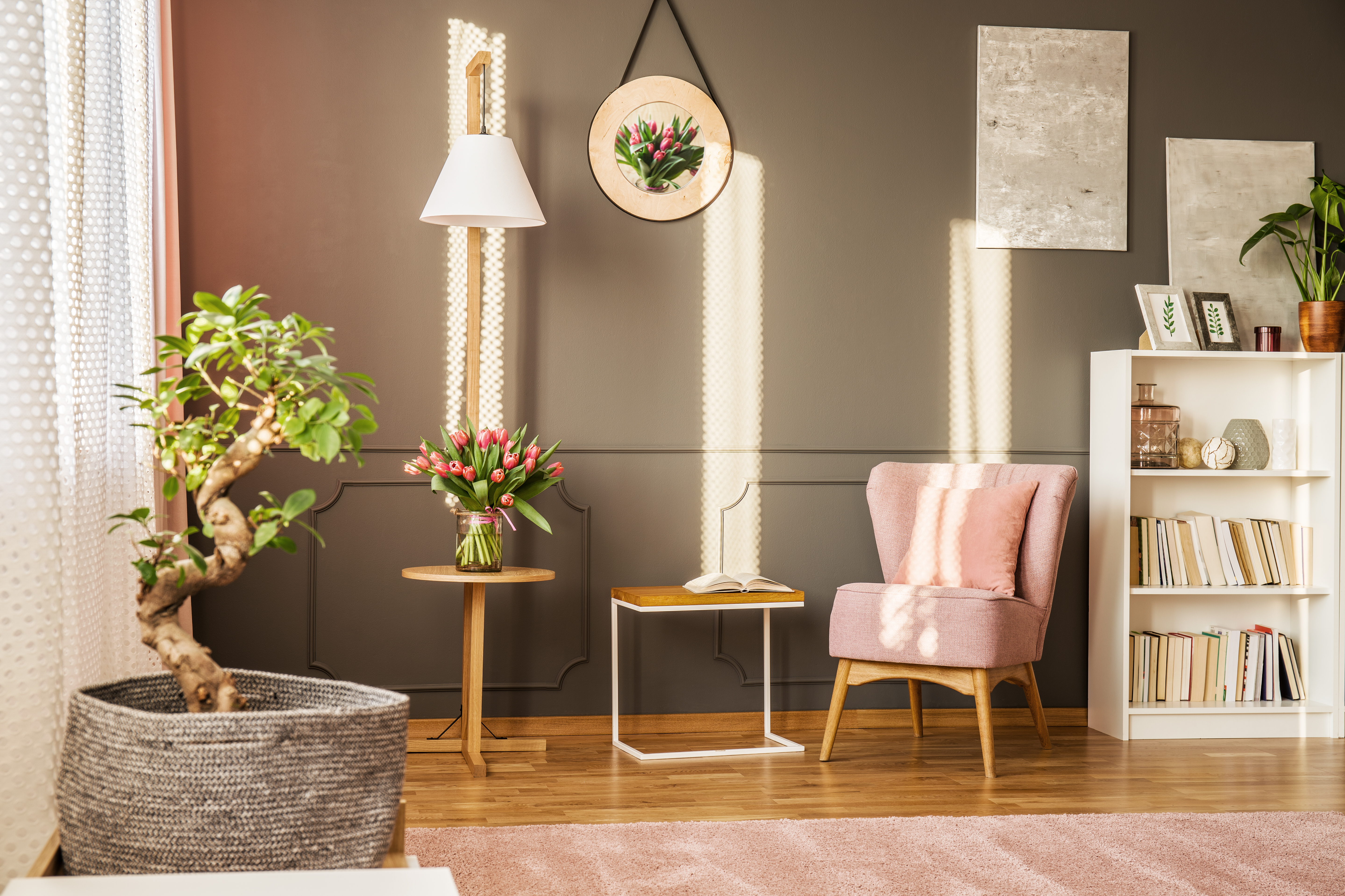 Cozy reading room interior with pink chair with pillow standing by the rack with books and decor