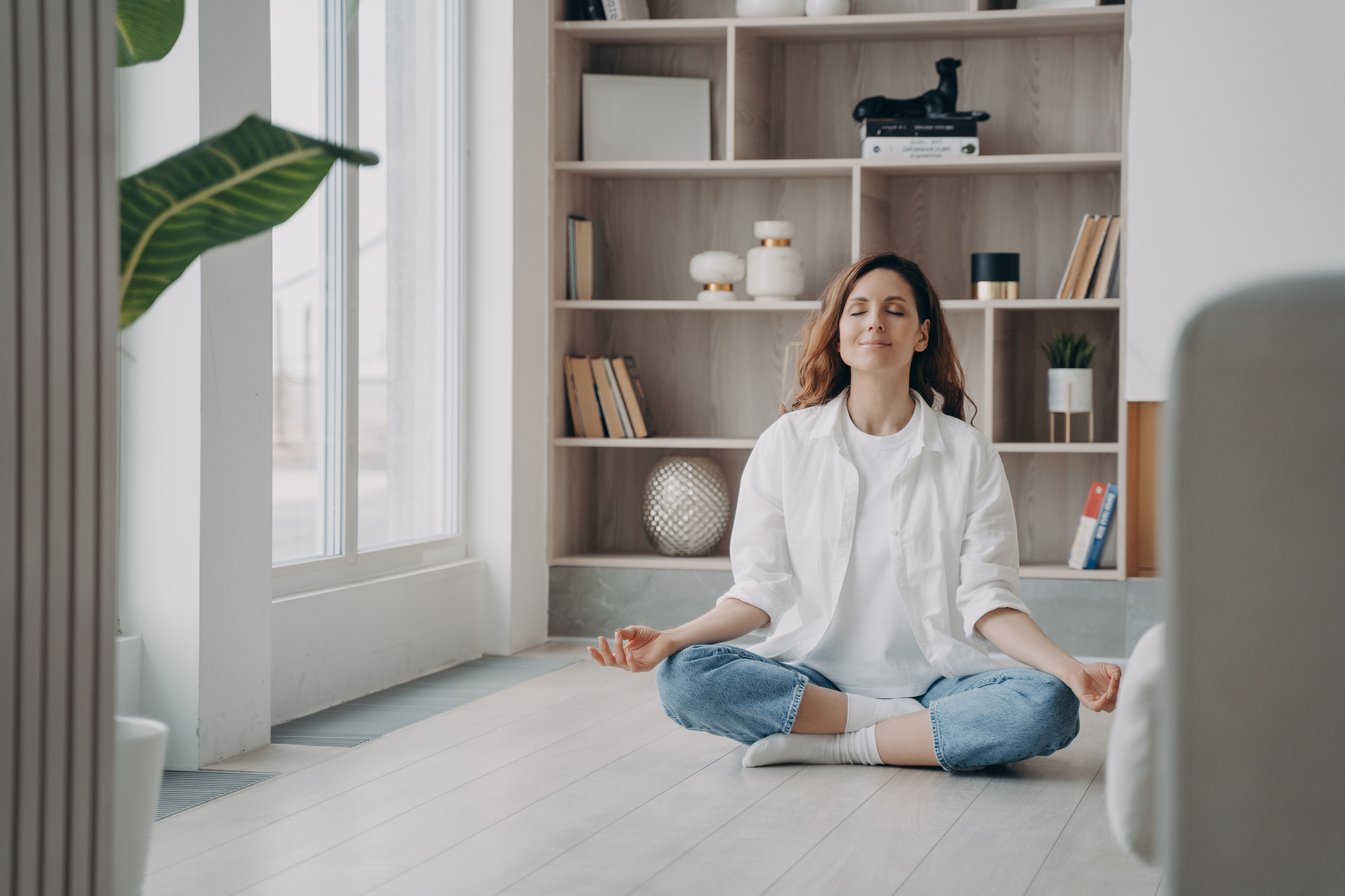Calm happy latin woman is practicing yoga and meditation on floor at home. Girl is sitting near window in morning in lotus asana. Morning gymnastics. Stress relief and mind balance concept.