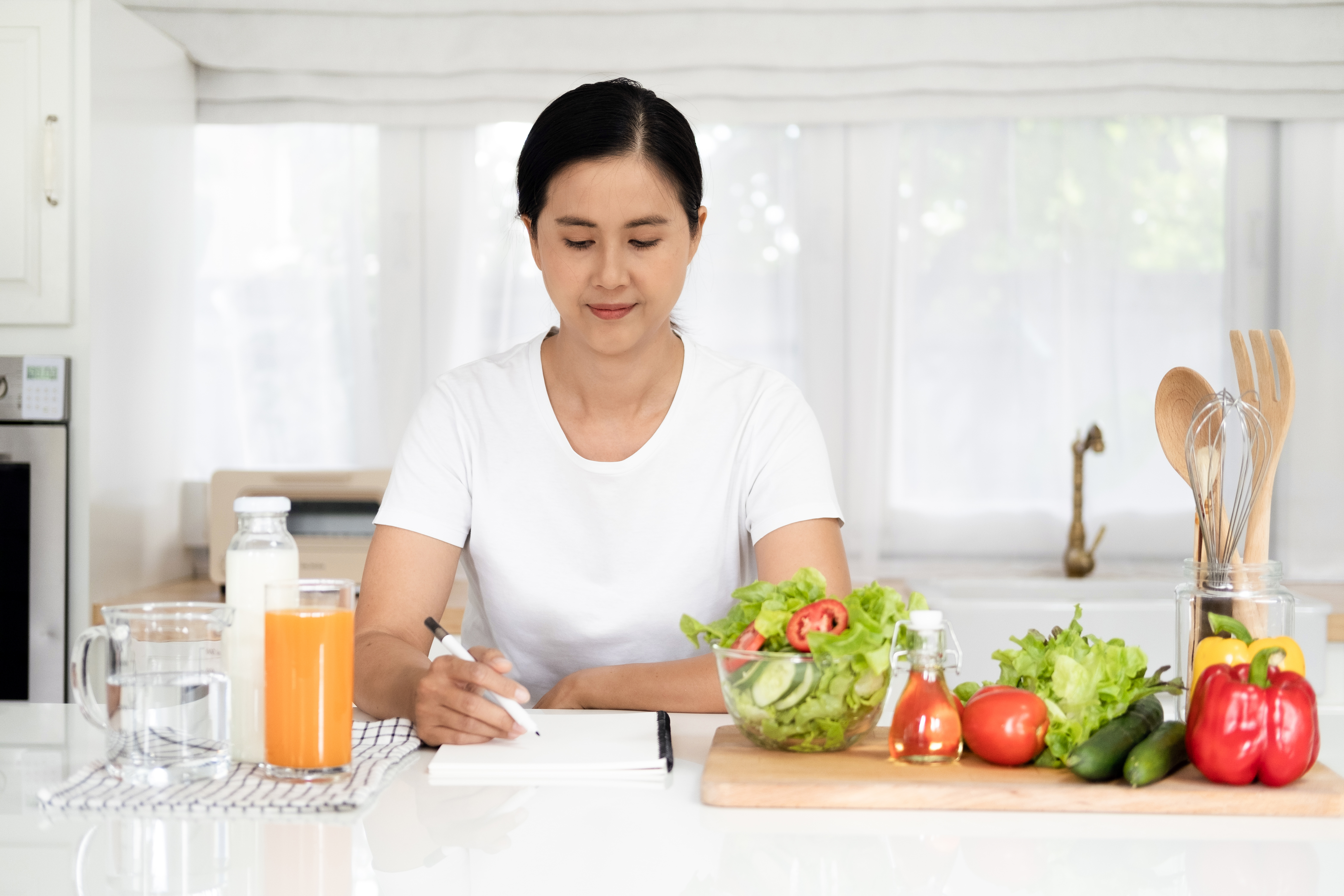 Diet, Dieting asian woman write diet plan right nutrition on table with fresh vegetables salad, is different food ingredients in the green. Nutritionist of healthy, nutrition of weight loss.