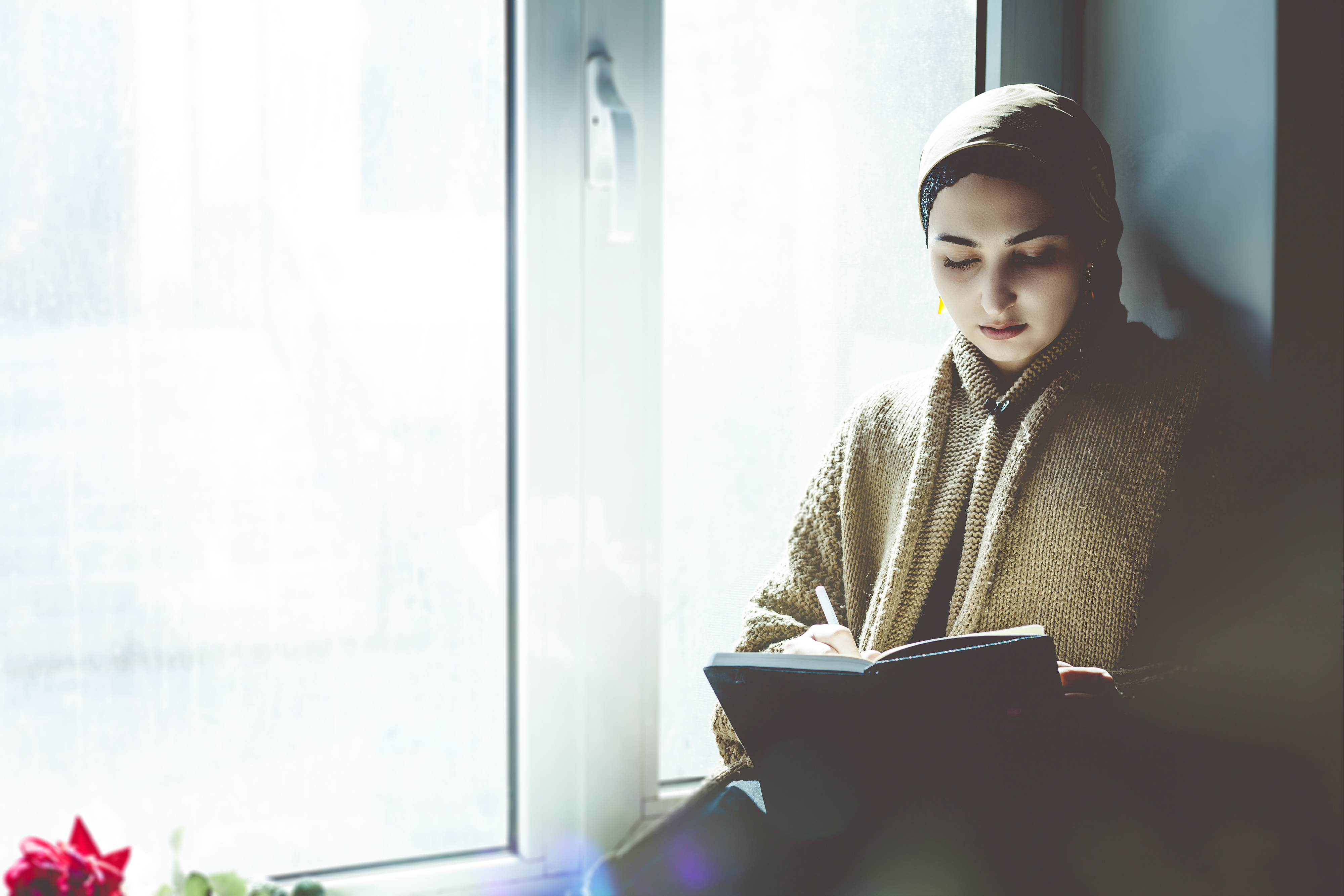 Young Muslim woman sits on the window sill. Middle-eastern writer woman sitting thoughtfully near the window and writing her story on the notepad. Iranian female making notes on her diary. Copy space