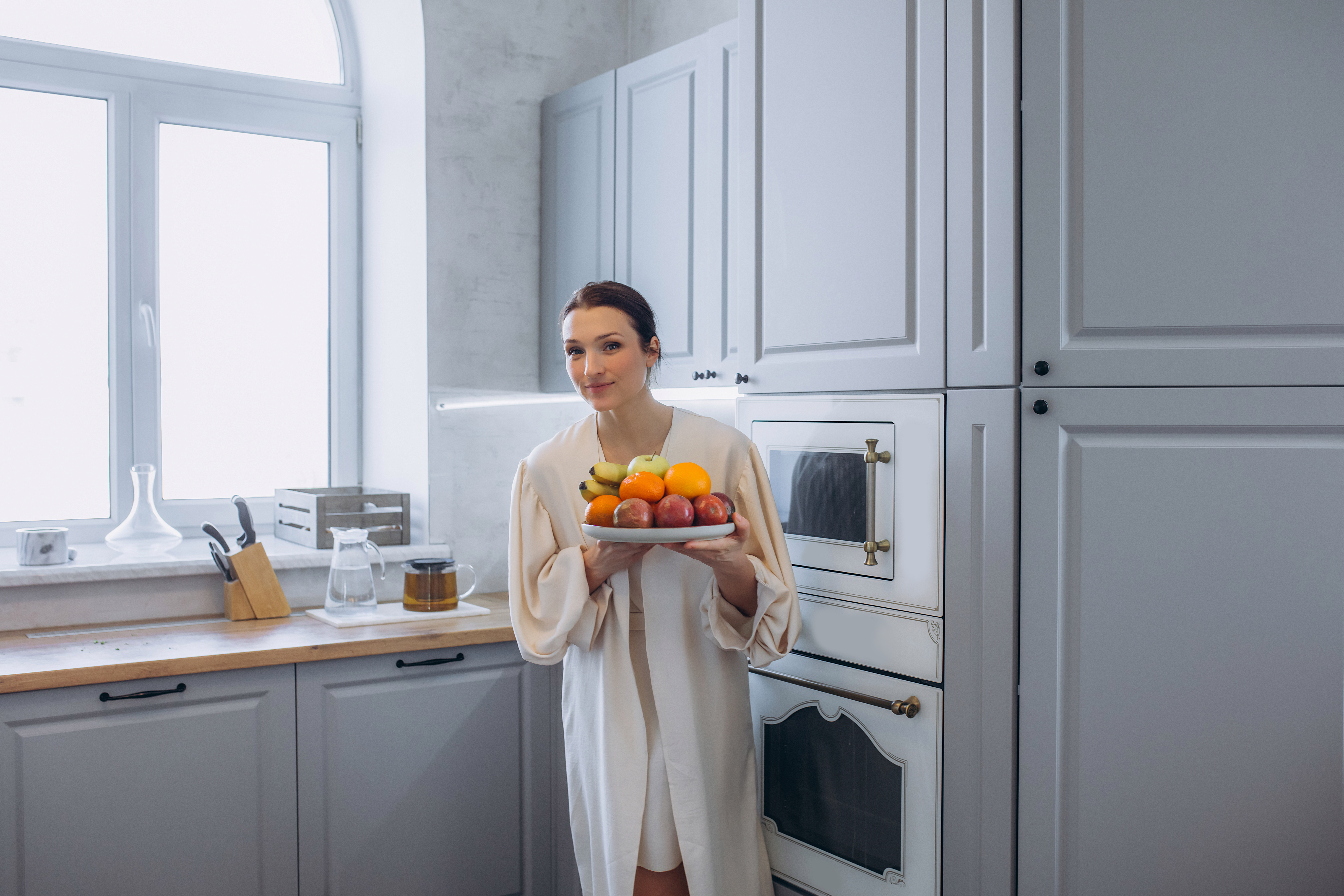 A beautiful brunette woman in the kitchen with a plate of fruit in her hands