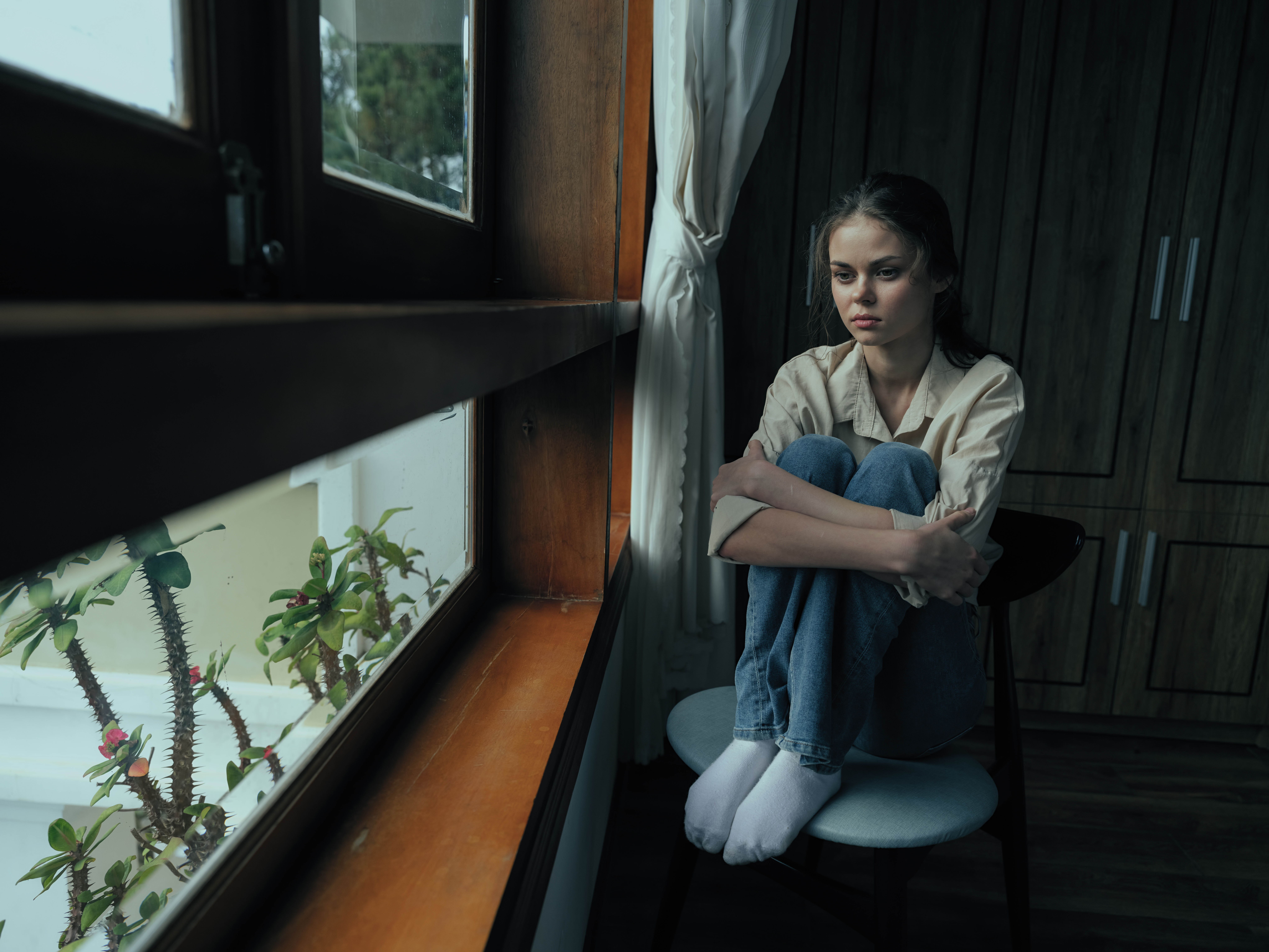 Woman fall depression sitting by the window and looking at nature, rainy weather and discouragement, home life style, loneliness. High quality photo
