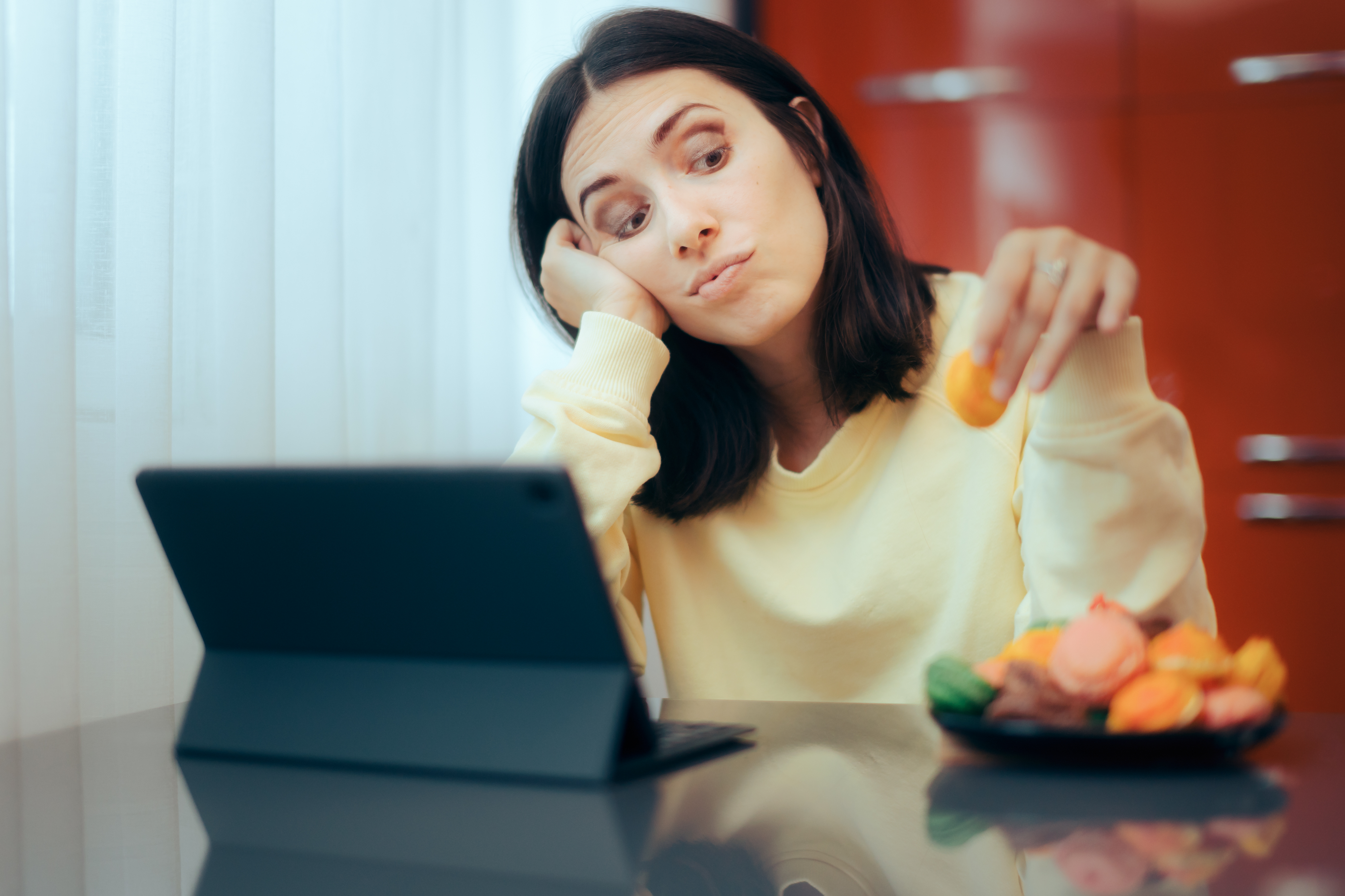 Young bored person eating cookies watching a streaming service online