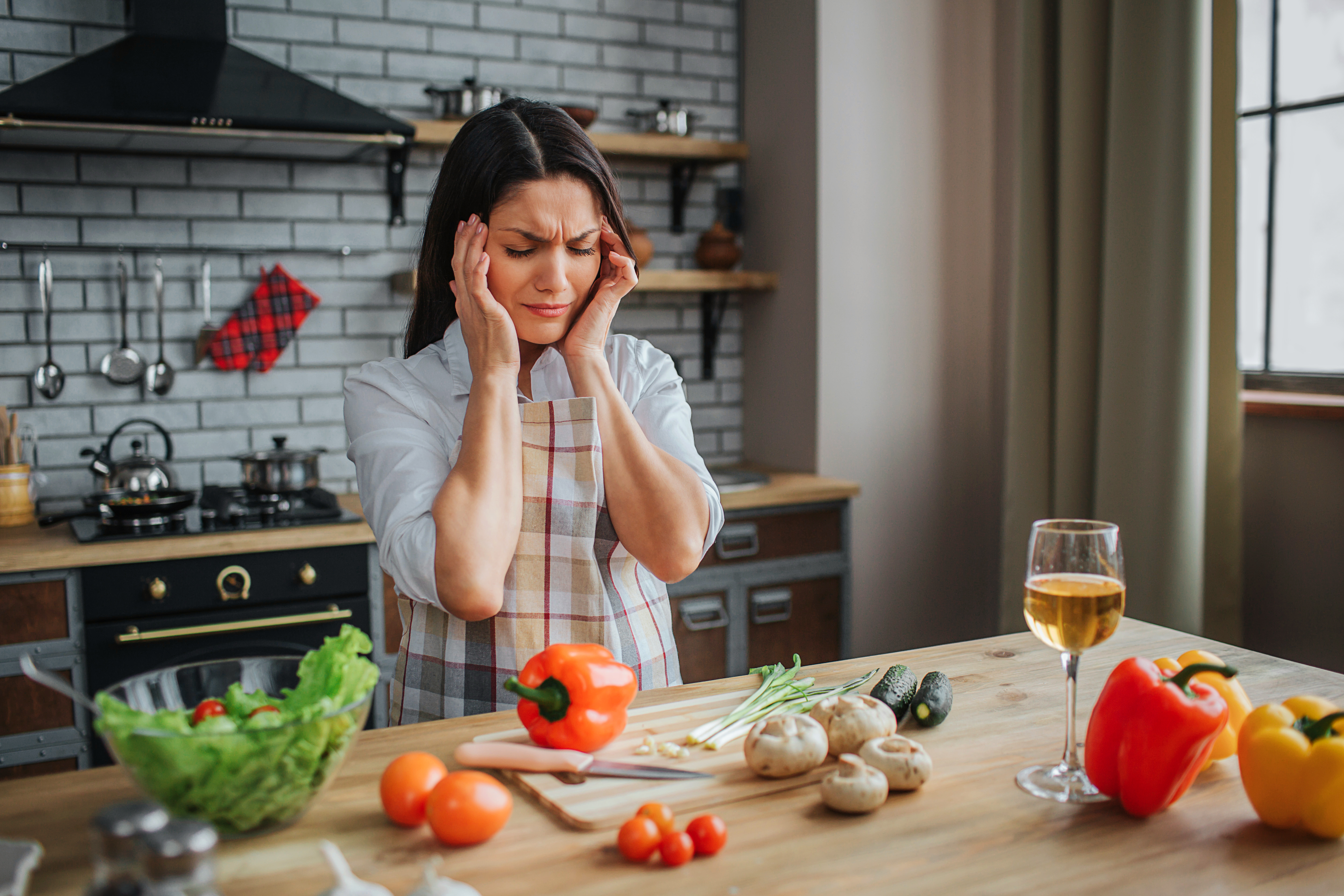 Young sick woman has headache. She hold hands on head. She sit in kitchen at table. Woman feel bad. Vegetables lying on table