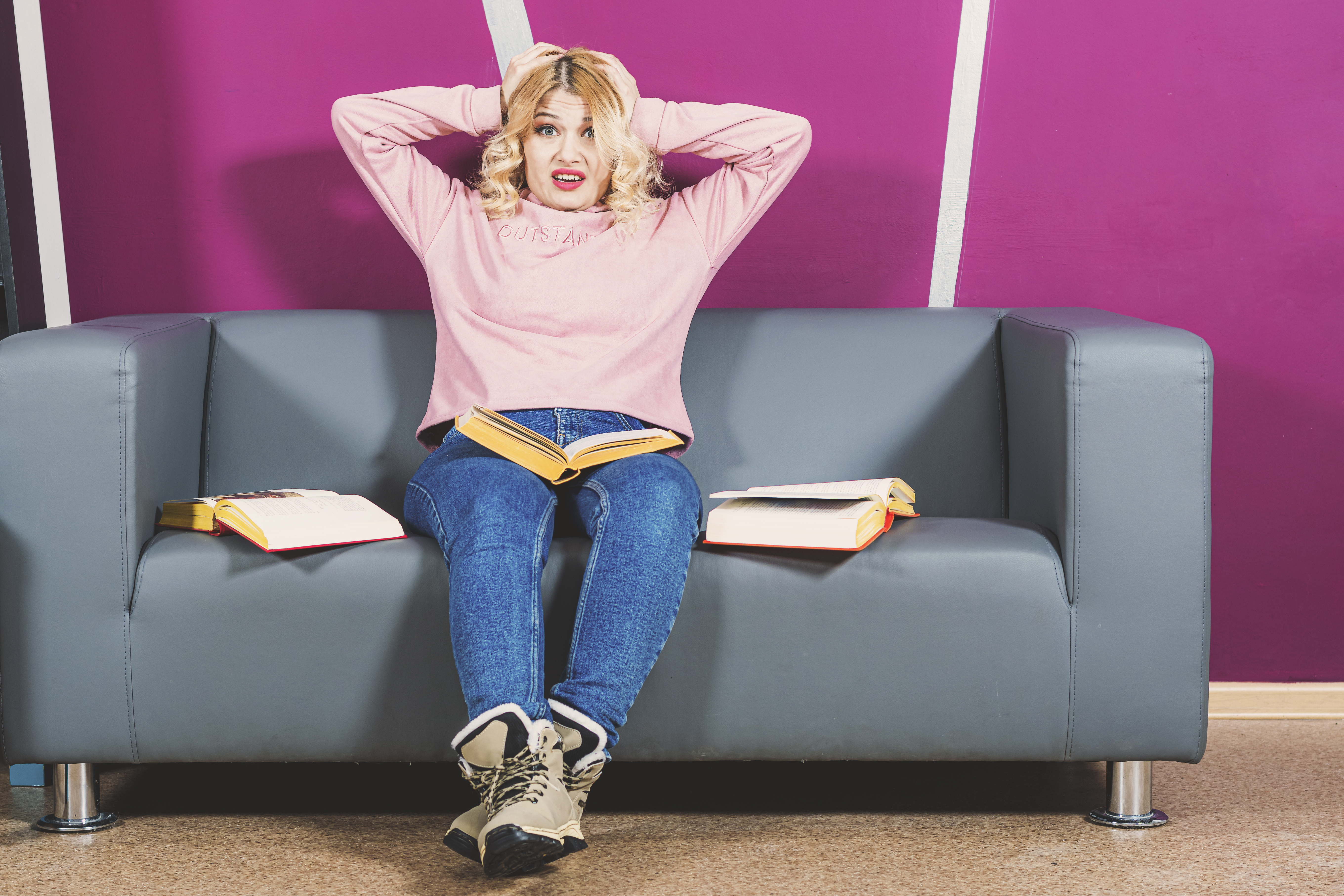 Young blonde girl sits on sofa in room and holds head with hands. On face of emotion of panic. Around her are open books. Difficulties in learning.
