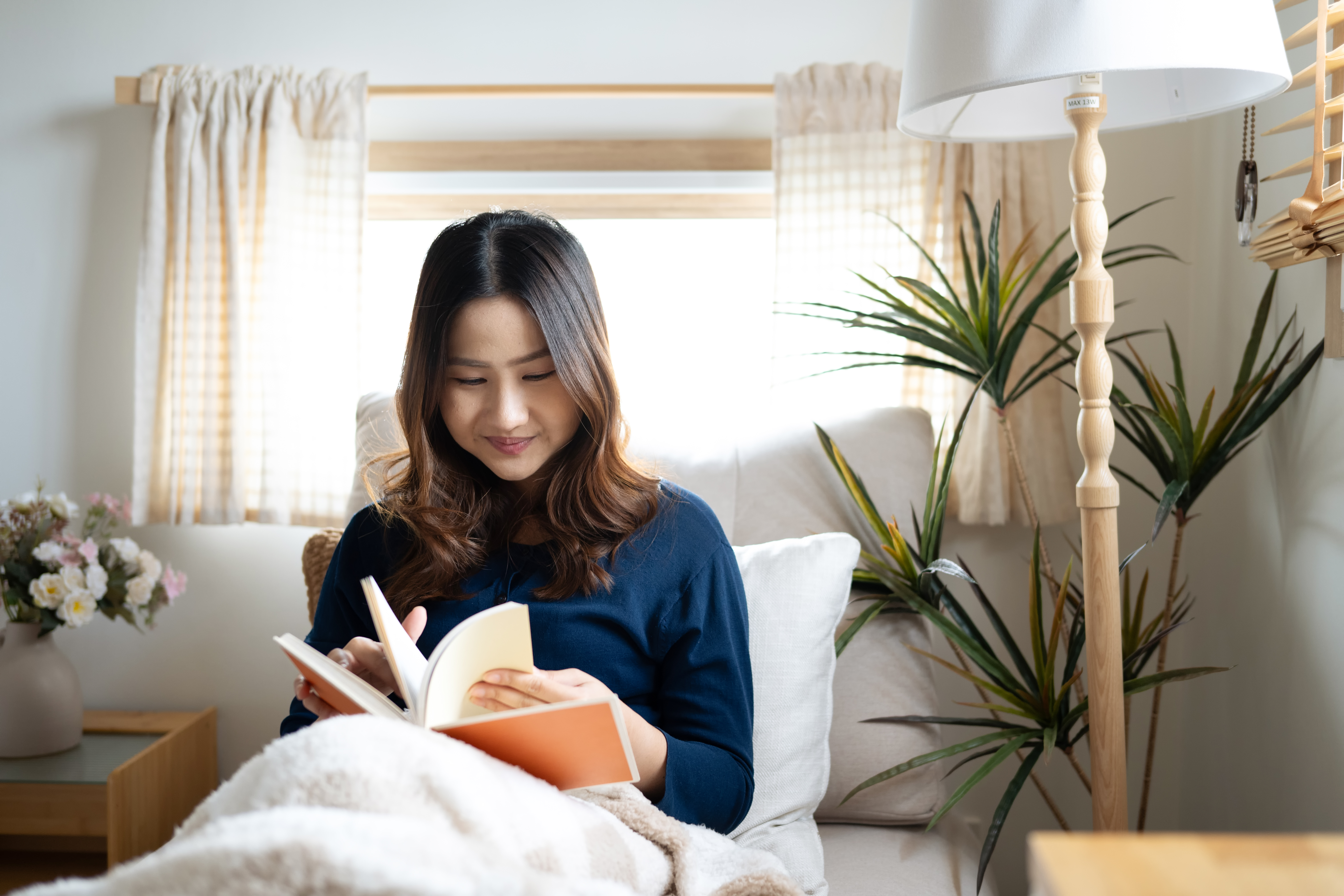Calm young woman sitting under soft blanket reading a book by the window at home.