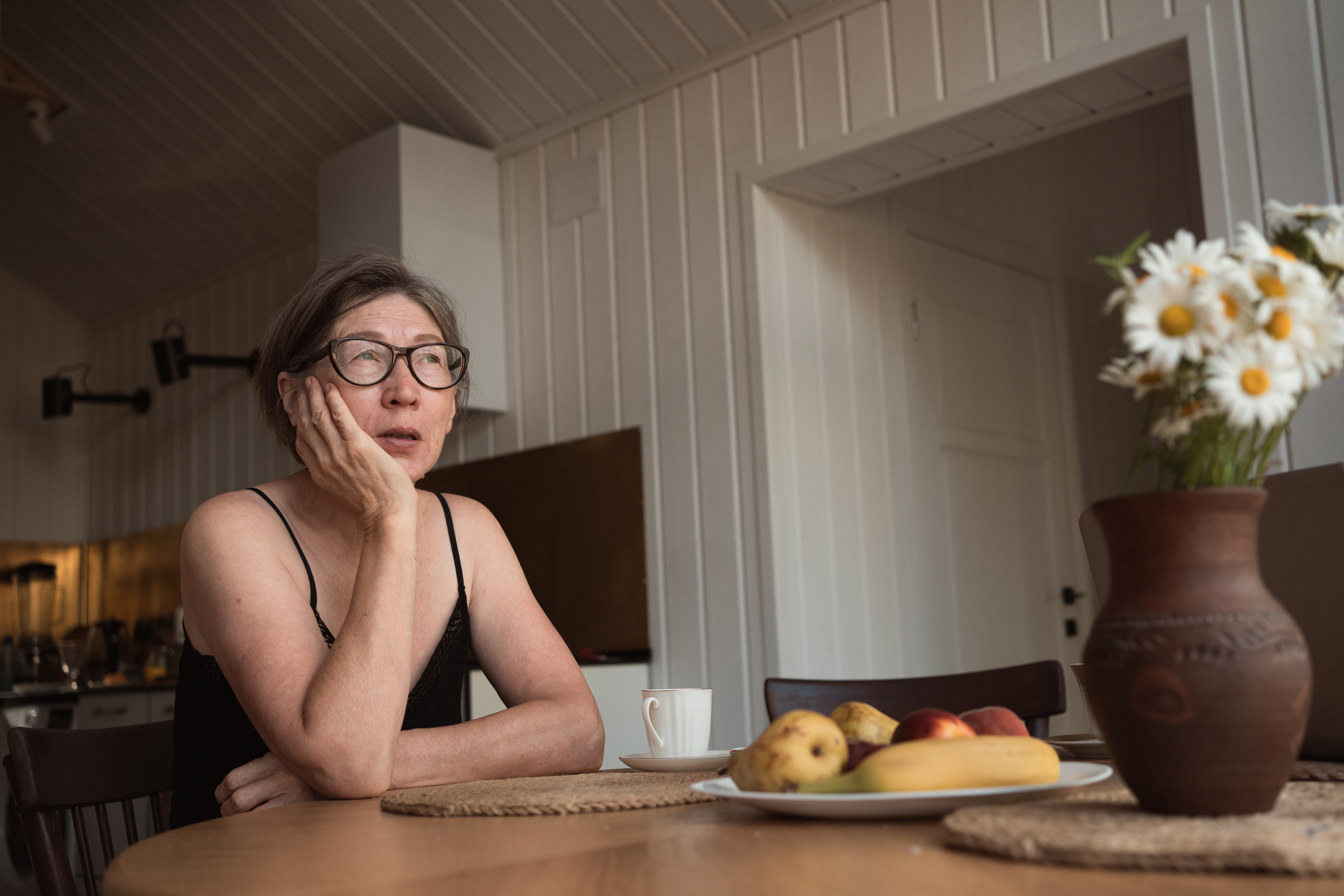 sad older adult elegant asian lady looking at camera posing at home drinking coffee. Portrait.