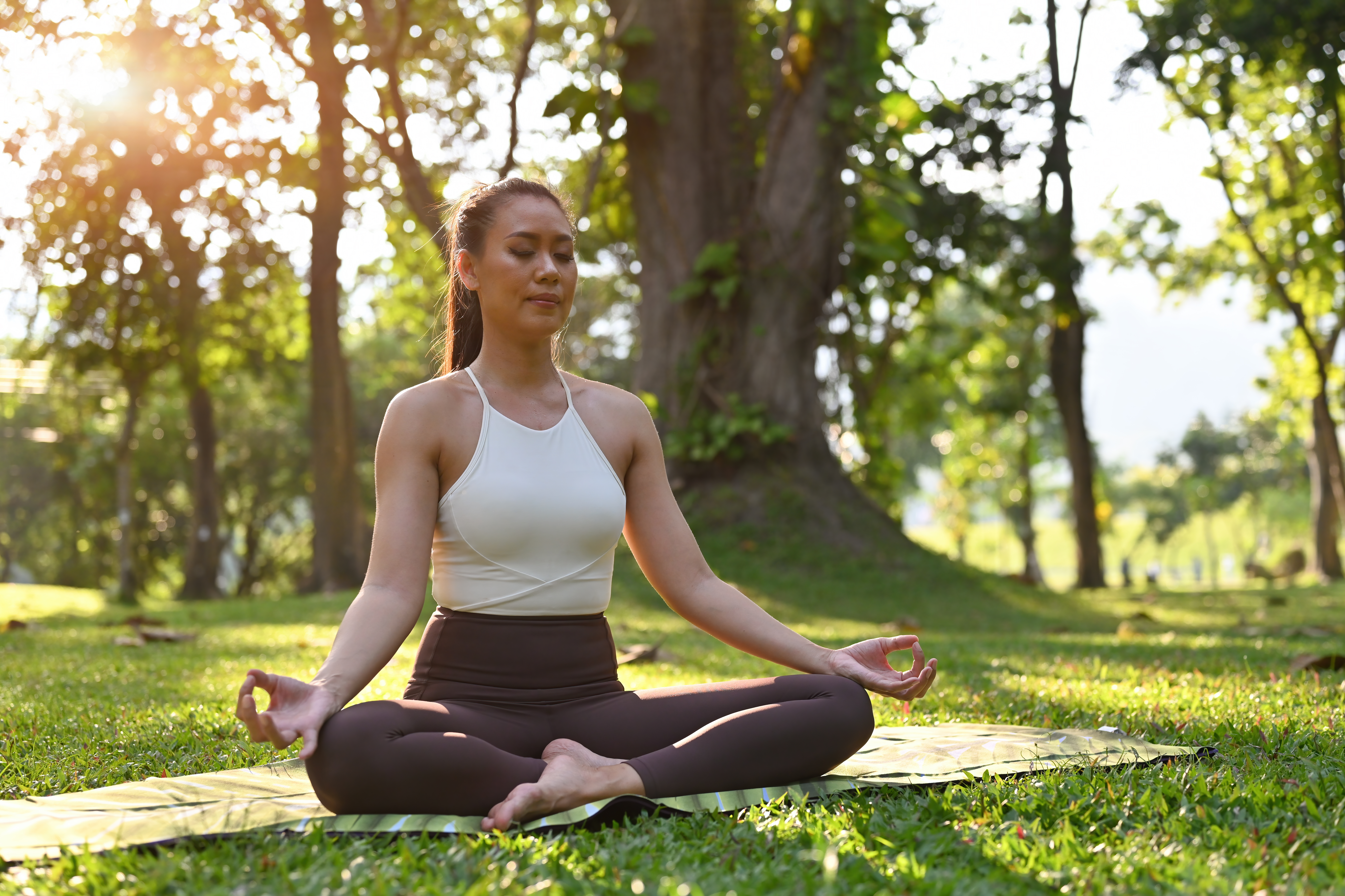 A woman practices meditation in the lotus position, her hands in a relaxed mudra, surrounded by vibrant greenery and bathed in warm sunlight.