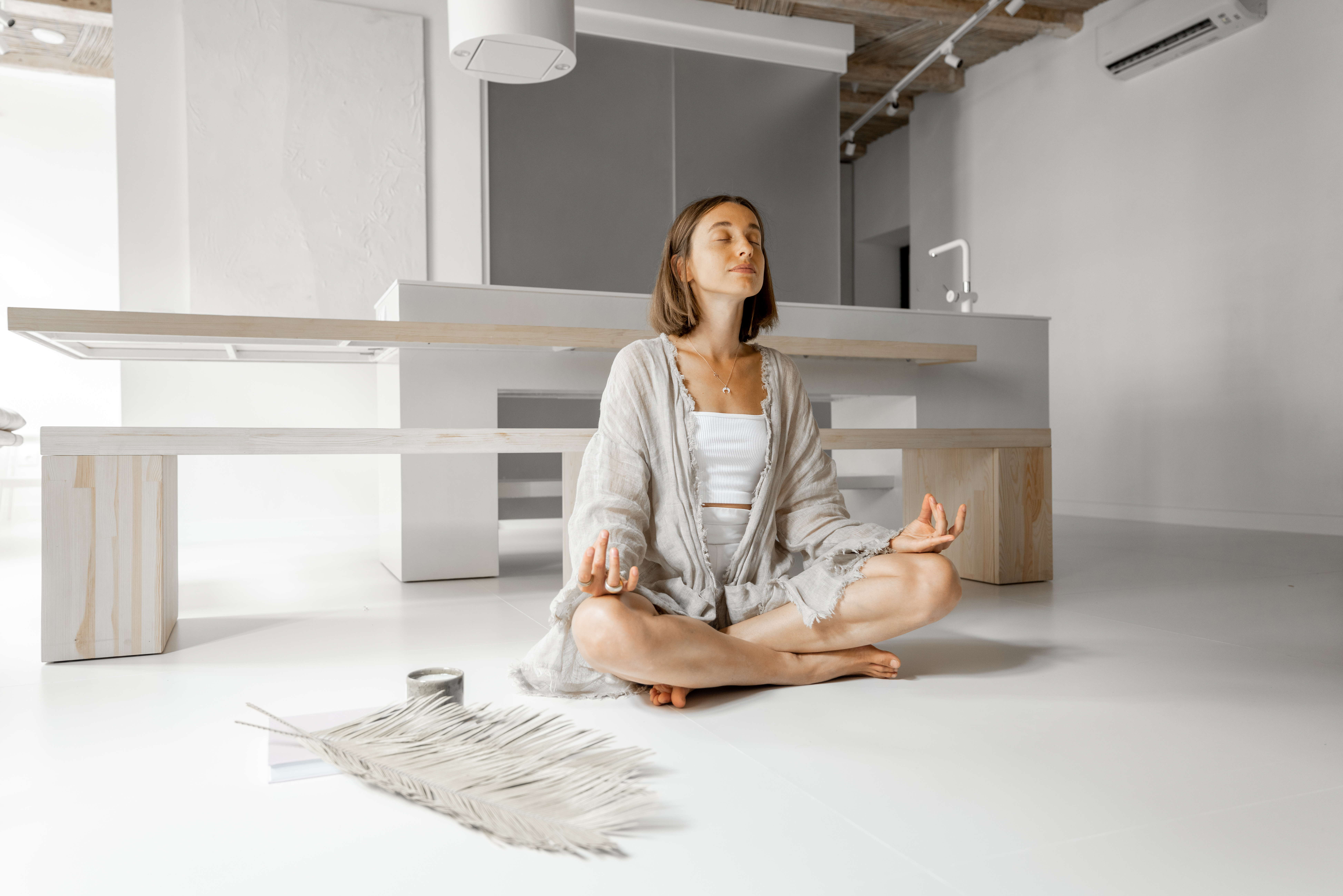 Woman meditating at home sitting in lotus position on the floor in modern studio apartment. Concept of calm and comfort at home