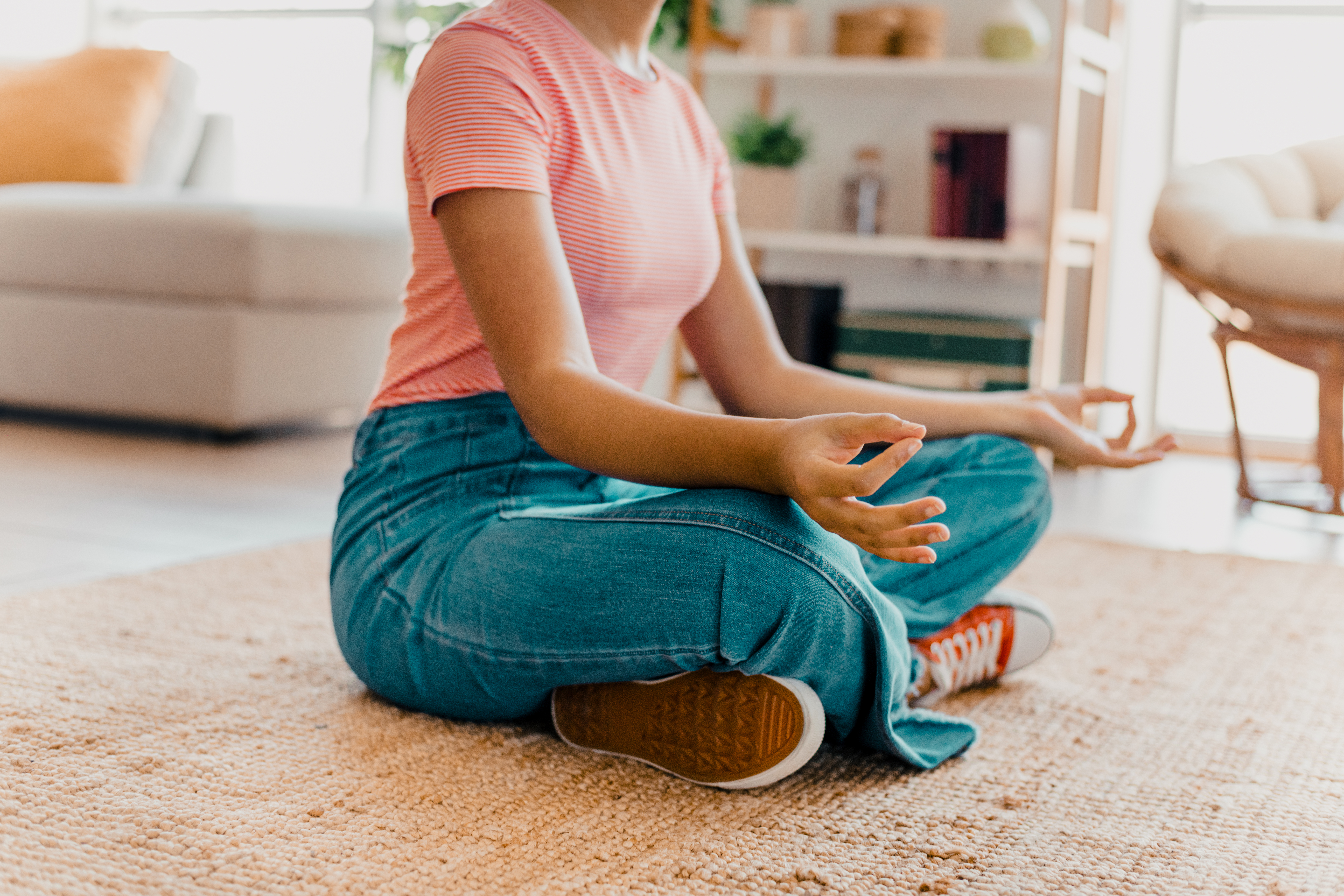 A young woman sits on a rug in a peaceful home interior, practicing meditation in natural daylight, wearing casual striped clothing.
