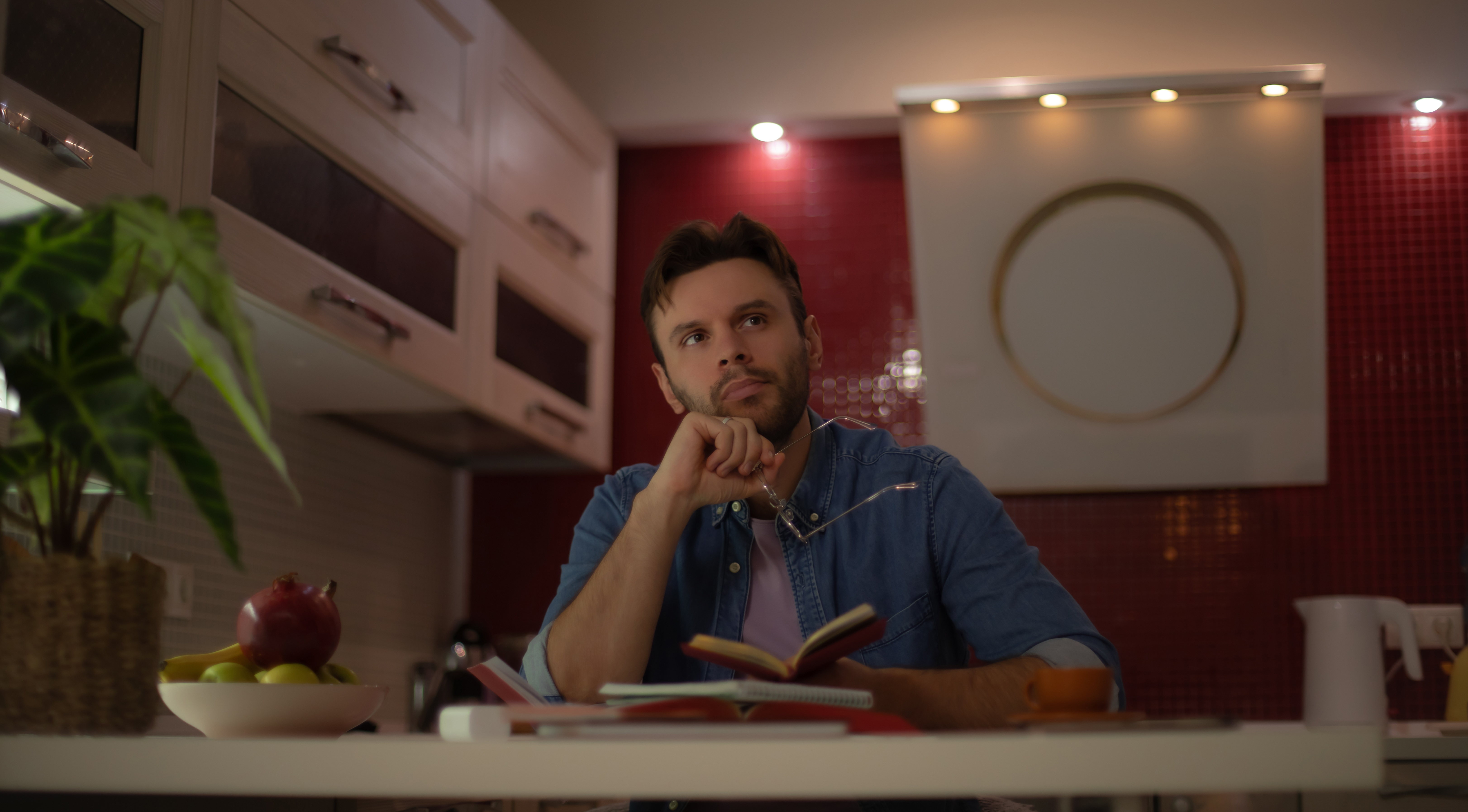 Thoughtful young man sitting at a kitchen table with books, notebook, and coffee, holding his glasses and looking away, appearing deep in thought or brainstorming ideas.
