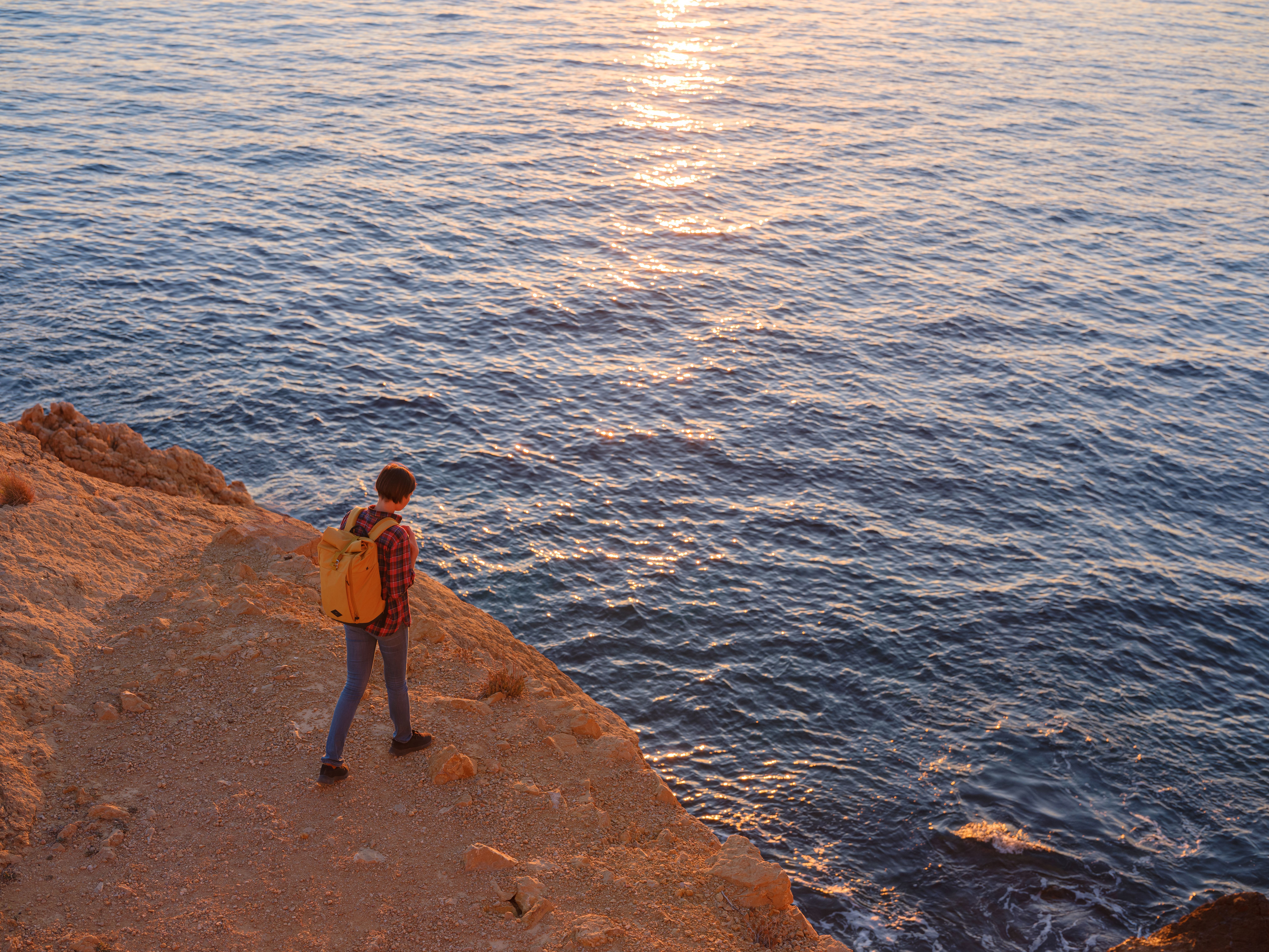 Young woman hiking on rocky beach in Spain, Benidorm. Watching the choppy sea and the bay. traveler enjoying freedom in serene nature landscape