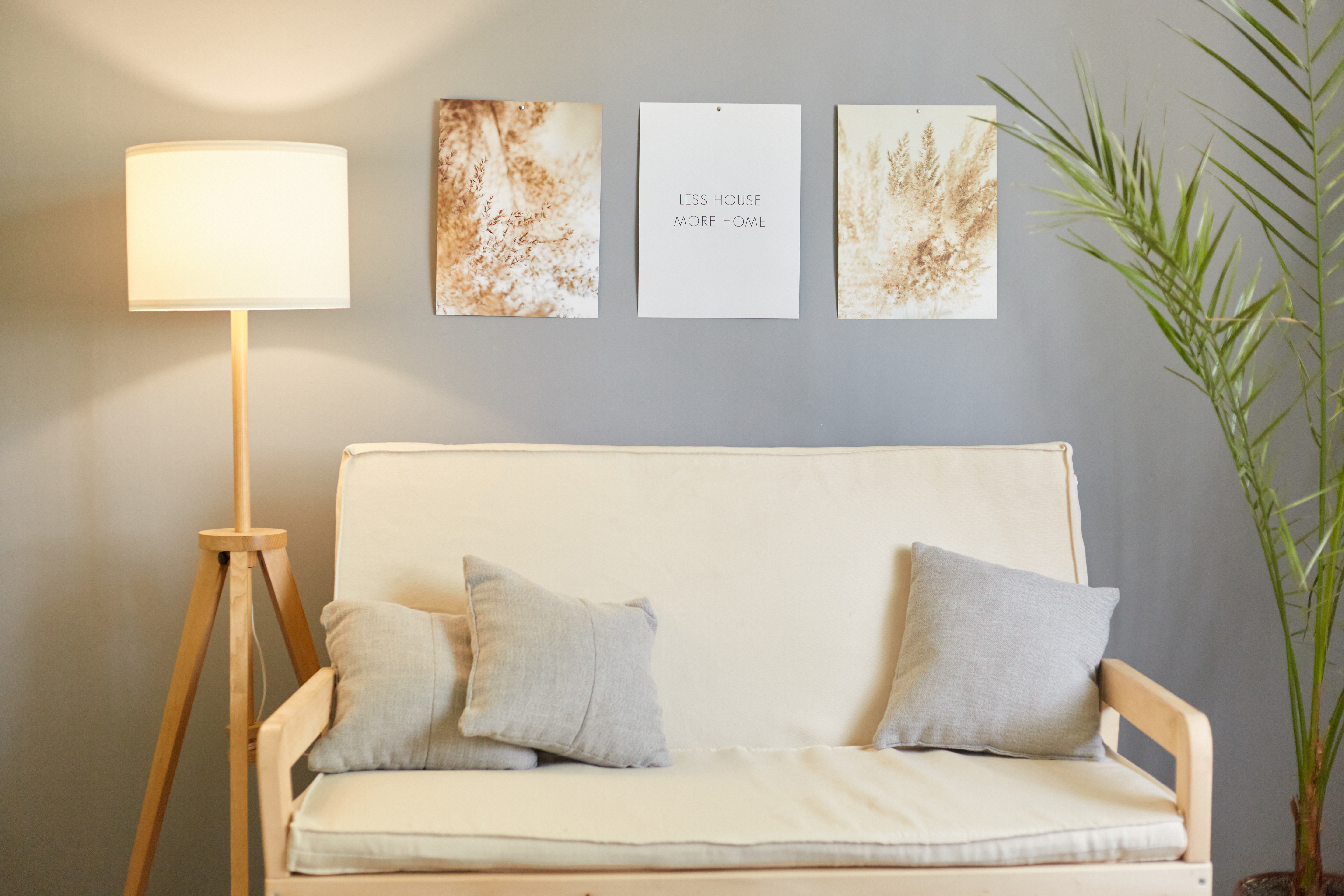 Cozy living room with gray decorated with pictures, green flower and lamp, stylish sofa with pillows.
