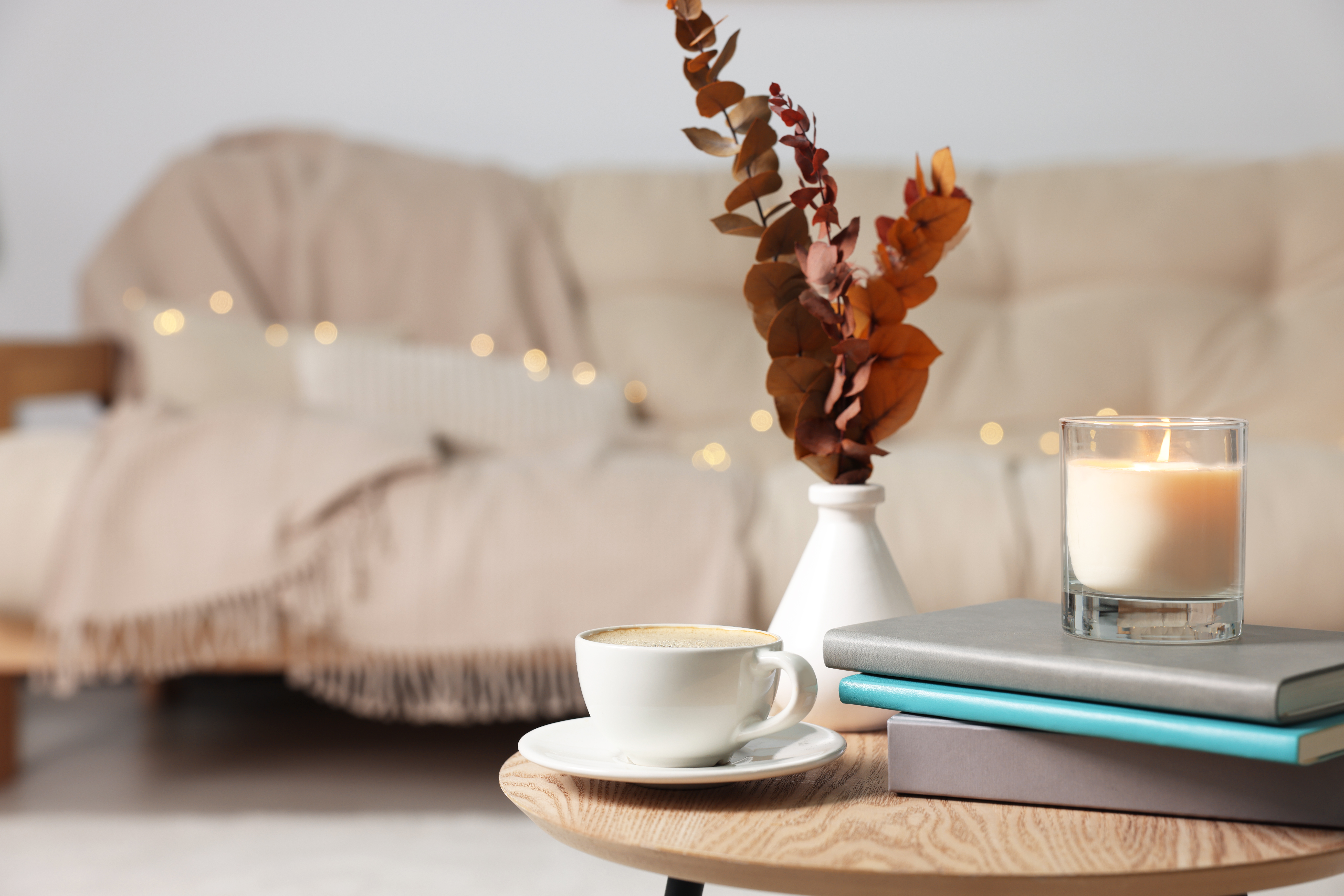 cup of tea on wooden tray on a round table with sofa in living room at home
